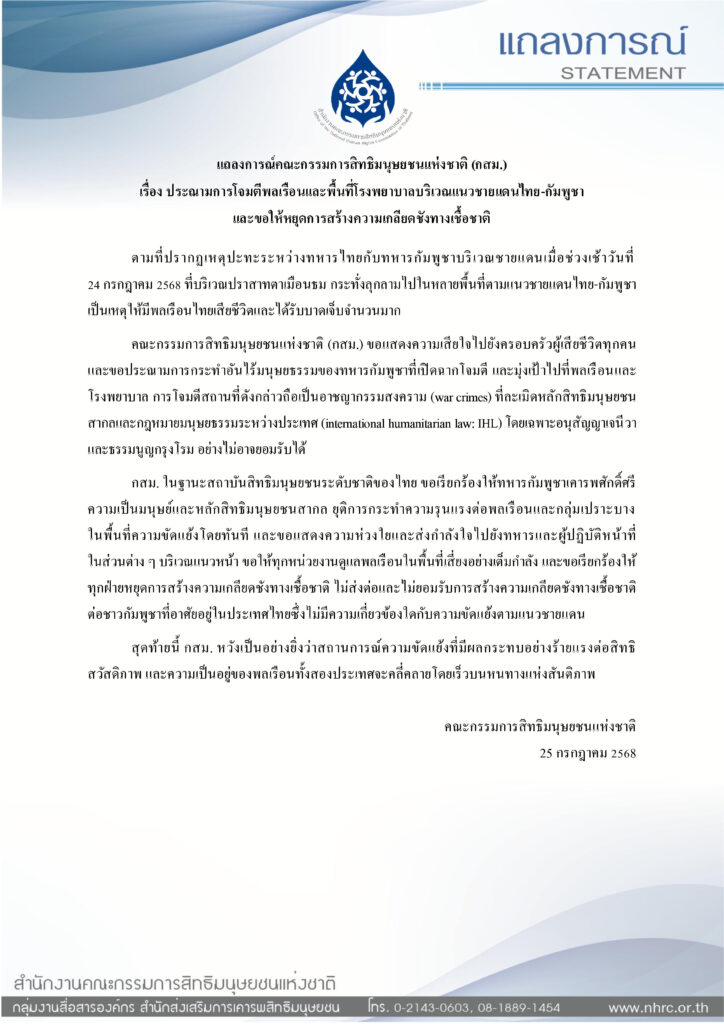 แถลงการณ์คณะกรรมการสิทธิมนุษยชนแห่งชาติ (กสม.) เรื่อง ประณามการโจมตีพลเรือนและพื้นที่โรงพยาบาลบริเวณแนวชายแดนไทย-กัมพูชา และขอให้หยุดการสร้างความเกลียดชังทางเชื้อชาติ ตามที่ปรากฏเหตุปะทะระหว่างทหารไทยกับทหารกัมพูชาบริเวณชายแดนเมื่อช่วงเช้าวันที่ 24 กรกฎาคม 2568 ที่บริเวณปราสาทตาเมือนธม กระทั่งลุกลามไปในหลายพื้นที่ตามแนวชายแดนไทย-กัมพูชา เป็นเหตุให้มีพลเรือนไทยเสียชีวิตและได้รับบาดเจ็บจำนวนมาก คณะกรรมการสิทธิมนุษยชนแห่งชาติ (กสม.) ขอแสดงความเสียใจไปยังครอบครัวผู้เสียชีวิตทุกคนและขอประณามการกระทำอันไร้มนุษยธรรมของทหารกัมพูชาที่เปิดฉากโจมตี และมุ่งเป้าไปที่พลเรือนและโรงพยาบาล การโจมตีสถานที่ดังกล่าวถือเป็นอาชญากรรมสงคราม (war crimes) ที่ละเมิดหลักสิทธิมนุษยชนสากลและกฎหมายมนุษยธรรมระหว่างประเทศ (international humanitarian law: IHL) โดยเฉพาะอนุสัญญาเจนีวาและธรรมนูญกรุงโรม อย่างไม่อาจยอมรับได้ กสม. ในฐานะสถาบันสิทธิมนุษยชนระดับชาติของไทย ขอเรียกร้องให้ทหารกัมพูชาเคารพศักดิ์ศรีความเป็นมนุษย์และหลักสิทธิมนุษยชนสากล ยุติการกระทำความรุนแรงต่อพลเรือนและกลุ่มเปราะบางในพื้นที่ความขัดแย้งโดยทันที และขอแสดงความห่วงใยและส่งกำลังใจไปยังทหารและผู้ปฏิบัติหน้าที่ในส่วนต่าง ๆ บริเวณแนวหน้า ขอให้ทุกหน่วยงานดูแลพลเรือนในพื้นที่เสี่ยงอย่างเต็มกำลัง และขอเรียกร้องให้ทุกฝ่ายหยุดการสร้างความเกลียดชังทางเชื้อชาติ ไม่ส่งต่อและไม่ยอมรับการสร้างความเกลียดชังทางเชื้อชาติต่อชาวกัมพูชาที่อาศัยอยู่ในประเทศไทยซึ่งไม่มีความเกี่ยวข้องใดกับความขัดแย้งตามแนวชายแดน สุดท้ายนี้ กสม. หวังเป็นอย่างยิ่งว่าสถานการณ์ความขัดแย้งที่มีผลกระทบอย่างร้ายแรงต่อสิทธิ สวัสดิภาพ และความเป็นอยู่ของพลเรือนทั้งสองประเทศจะคลี่คลายโดยเร็วบนหนทางแห่งสันติภาพ คณะกรรมการสิทธิมนุษยชนแห่งชาติ 25 กรกฎาคม 2568