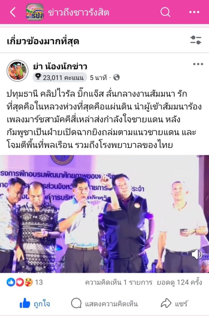 ปทุมธานี-คลิปไวรัล บิ๊กแจ็ส ลั้นรับไม่ได้กลางงานสัมมนา รักที่สุดคือในหลวงห่วงที่สุดคือแผ่นดิน นำพนักงานร้องเพลงมาร์ชสามัคคีสี่เหล่าส่งกำลังใจชายแดนวันศุกร์ที่ 25 กรกฎาคม พ.ศ.2568 ผู้สื่อข่าวได้รับแจ้งว่าในโซเชี่ยวเน็ตเวิร์ค เช่น กลุ่มข่าวถึงชาวรังสิต ซึ่งมีผู้ติดตามกว่า 270,000 คน และกลุ่มไลน์ ต่างๆ ของจังหวัดปทุมธานี มีการแชร์ภาพ บรรยากาศงาน สัมมนา ที่พลตำรวจโท คำรณวิทย์ ธูปกระจ่าง นายกองค์การบริหารส่วนจังหวัดปทุมธานี พร้อมด้วย ร้อยตำรวจเอก ดร.ตรีลุพธ์ ธูปกระจ่าง นายกเทศมนตรีนครรังสิต และ นายยุทธศักดิ์ ชูประเสริฐ นายกเทศมนตรีเมืองคลองหลวง ได้เข้าร่วม ซึ่งในคลิปที่แชร์กัน พลตำรวจโท คำรณวิทย์ ธูปกระจ่าง นายกองค์การบริหารส่วนจังหวัดปทุมธานี ได้กล่าวว่า รักที่สุดคือในหลวง ห่วงที่สุดคือแผนดิน สร้างความประทับใจให้กับผู้ที่ได้รับชมคลิปมีการแชร์กันอย่างมากในจังหวัดปทุมธานีนอกจากนี้ ยังร่วมกันร้องเพลง มาร์ชสามัคคีสี่เหล่าส่งกำลังใจชายแดน อีกด้วยผู้สื่อข่าวจึงตรวจสอบพบว่า งานเลี้ยงดังกล่าวเป็นโครงการฝึกอบรมพัฒนาศักยภาพของผู้บริหาร สมาชิกสภาองค์การบริหารส่วนจังหวัด ข้าราชการ ลูกจ้างประจำ และพนักงานจ้างขององค์การบริหารส่วนจังหวัดปทุมธานี เพื่อเพิ่มประสิทธิภาพในกาปฏิบัติงาน ประจำปีงบประมาณ พ.ศ. 2568 อบรมเรื่องการสร้างความตระหนักรู้และการป้องกันตนเองจากภัยคุกคามทางออนไลน์ สำหรับโครงการฝึกอบรมครั้งนี้ จัดขึ้นระหว่างวันที่ 24–26 กรกฎาคม 2568 เพื่อเสริมสร้างองค์ความรู้ ทักษะการบริหารงานสมัยใหม่ และส่งเสริมการทำงานร่วมกันอย่างมีประสิทธิภาพในหน่วยงานพล.ต.ท คำรณวิทย์ ธูปกระจ่างกล่าวกับผู้ที่เข้าอบรมว่าตนเองได้ติดตามข่าวการ สู้รบตามแนวชายแดน หลังกัมพูชาเป็นฝ่ายเปิดฉากยิงถล่มตามแนวชายแดน และโจมตีพื้นที่พลเรือน รวมถึงโรงพยาบาลของไทย ซึ่งพลตำรวจโท คำรณวิทย์ ธูปกระจ่าง นายกองค์การบริหารส่วนจังหวัดปทุมธานี พร้อมด้วย ร้อยตำรวจเอก ดร.ตรีลุพธ์ ธูปกระจ่าง นายกเทศมนตรีนครรังสิต และ นายยุทธศักดิ์ ชูประเสริฐ นายกเทศมนตรีเมืองคลองหลวง ได้ร่วมกันร้อง เพลงมาร์ชสามัคคีสี่เหล่าส่งกำลังใจชายแดน ทหารหาญที่กำลังปกป้องอธิปไตยของไทยอย่างกล้าหาญ โดย พลตำรวจโท คำรณวิทย์ ธูปกระจ่าง นายกองค์การบริหารส่วนจังหวัดปทุมธานี ได้บอกย้ำ กับผู้ที่เข้ารับการอบรม หลายครั้งว่า รักที่สุดคือในหลวง ห่วงที่สุดคือแผนดิน โดยทาง องค์การบริหารส่วนจังหวัดได้เตรียม สิ่งของจำเป็นกับยาและอาหารเตรียมส่งไปเป็นกำลังใจและ เช