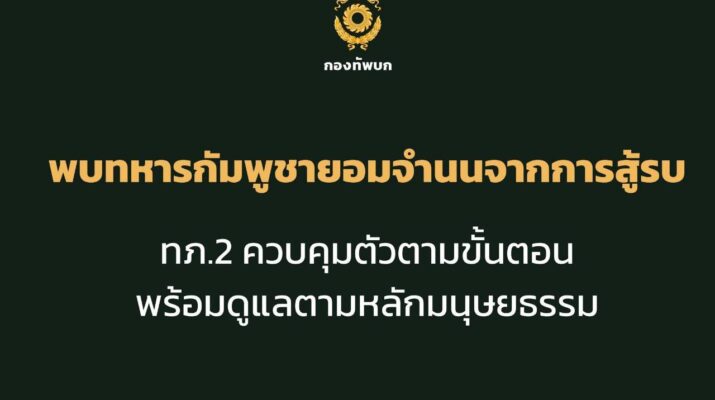 During these operations, several Cambodian soldiers surrendered without displaying any threatening posture or behavior toward the Thai side. The unit proceeded to disarm and detain them according to proper procedures, strictly adhering to international humanitarian principles. The detainees comprise 18 personnel: 1 Second Lieutenant, 2 Master Sergeant Second Class, 12 Sergeant, 2 Corporal, and 1 Lance Corporal. Among them, 1 person sustained injuries: Sergeant Mom Ridti, who suffered gunshot wounds to the right hip and left arm. The Thai side subsequently arranged for his surgical treatment at the hospital. Additionally, 2 fatalities were discovered in the area.