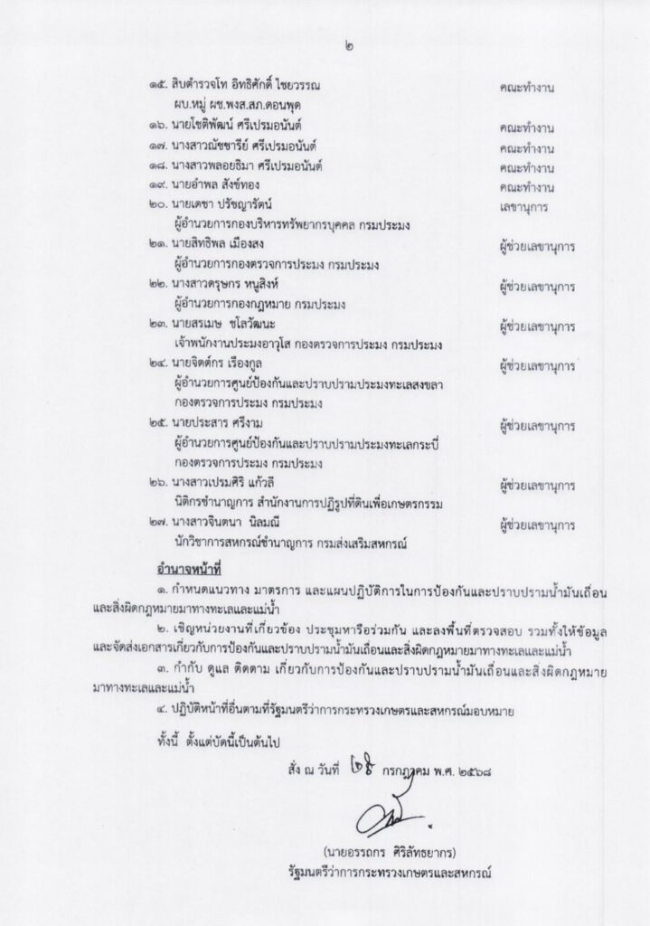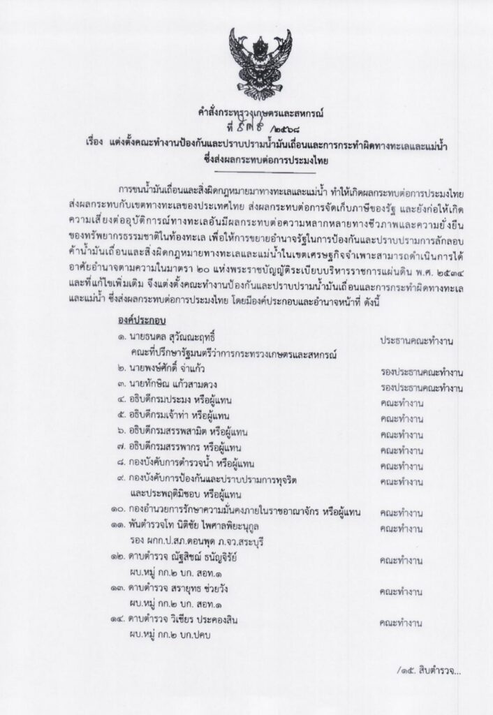รมว.เกษตรฯ เซ็นตั้ง“ธนดล”เป็น หน."คณะทำงานป้องกัน และปราบปรามน้ำมันเถื่อนและการกระทำผิดทางทะเลและแม่น้ำซึ่งส่งผลกระทบต่อ การประมงไทย" เมื่อวันที่ 1 ส.ค.68 ผู้สื่อข่าวรายงานว่า นายอรรถกร ศิริลัทธยากร ลงนามในคำสั่งกระทรวงเกษตรและสหกรณ์ ที่ 579 /2568 เรื่องแต่งตั้งคณะทำงานป้องกันและปราบปรามน้ำมันเถื่อนและการกระทำผิดทางทะเลและแม่น้ำซึ่งส่งผลกระทบต่อการประมงไทย โดยเหตุผลในคำสั่งมีว่า การขนน้ำมันเถื่อนและสิ่งผิดกฎหมายมาทางทะเลและแม่น้ำ ทำให้เกิดผลกระทบต่อการประมงไทย ส่งผลกระทบกับเขตทางทะเลของประเทศไทย ส่งผลกระทบต่อการจัดเก็บภาษีของรัฐ และยังก่อให้เกิดความเสี่ยงต่ออุบัติการณ์ทางทะเลอันมีผลกระทบต่อความหลากหลายทางชีวภาพและความยั่งยืนของทรัพยากรธรรมชาติในท้องทะเล เพื่อให้การขยายอำนาจรัฐในการป้องกันและปราบปรามการลักลอบค้าน้ำมันเถื่อนและสิ่งผิดกฎหมายทางทะเลและแม่น้ำในเขตเศรษฐกิจจำเพาะสามารถดำเนินการได้ อาศัยอำนาจตามความในมาตรา 20 แห่งพระราชบัญญัติระเบียบบริหารราชการแผ่นดิน พ.ศ.2534 และที่แก้ไขเพิ่มเติม จึงแต่งตั้งคณะทำงานป้องกันและปราบปรามน้ำมันเถื่อนและการกระทำผิดทางทะเลและแม่น้ำ ซึ่งส่งผลกระทบต่อการประมงไทย โดยมี นายธนดล สุวัณณะฤทธิ์ เป็นประธานคณะทำงาน ฯ