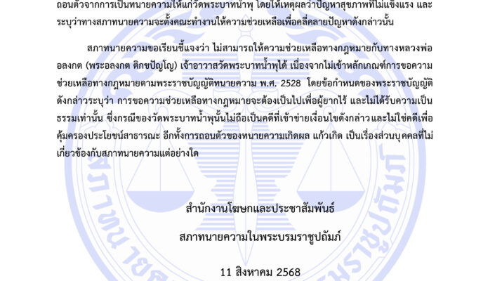 สภาทนายความ ยันไม่ตั้งคณะทำงานช่วยคดีเจ้าอาวาสวัดพระบาทน้ำพุ ปม "ทนายเกิดผล แก้วเกิด" โพสต์ถอนตัวไม่ว่าความให้"พระอลงกต" อ้างสุขภาพไม่ดี ชี้ไม่ใช่คดีเพื่อประโยชน์สาธารณะ-การถอนตัวของ"ทนายความ" เป็นเรื่องส่วนบุคคล ไม่เกี่ยวข้องกับสภาทนายความ กรณีเมื่อวันที่ 10 ส.ค.ที่ผ่านมา เพจเฟซบุ๊ก “ทนายเกิดผล แก้วเกิด“ ทนายความคนดัง ที่เคยรับเป็นทนายความของหลวงพ่ออลงกต เจ้าอาวาสวัดพระบาทน้ำพุ ได้ออกมาโพสต์ระบุข้อความว่า “เรียนสื่อมวลชน เนื่องจาก สภาทนายความได้มีการตั้งคณะทำงาน เพื่อคลี่คลายคดีของวัดพระบาทน้ำพุ อย่างเป็นทางการในวัน สองวันนี้ ดังนั้น เพื่อการทำงานของคณะทนายความเป็นเอกภาพในการดำเนินการของคณะทำงาน และเนื่องจากสุขภาพผมไม่แข็งแรง อาจจะเป็นอุปสรรคในการเดินทางไปร่วมงานและร่วมประชุมกับคณะทำงานของสภาทนายความ ล่าสุดวันนี้ (11 ส.ค.) สำนักโฆษกและประชาสัมพันธ์ของสภาทนายความได้ เผยแพร่ประกาศของสภาทนายความในพระบรมราชูปถัมภ์ว่า สภาทนายความขอเรียนชี้แจงว่า ไม่สามารถให้ความช่วยเหลือทางกฎหมายกับทางหลวงพ่ออลงกต (พระอลงกต ติกขปัญโญ) เจ้าอาวาสวัดพระบาทน้ำพุได้ เนื่องจากไม่เข้าหลักเกณฑ์การขอความช่วยเหลือทางกฎหมายตามพระราชบัญญัติทนายความ พ.ศ. 2528 โดยข้อกำหนดของพระราชบัญญัติดังกล่าวระบุว่า การขอความช่วยเหลือทางกฎหมายจะต้องเป็นไปเพื่อผู้ยากไร้ และไม่ได้รับความเป็นธรรมเท่านั้น ซึ่งกรณีของวัดพระบาทน้ำพุนั้นไม่ถือเป็นคดีที่เข้าข่ายเงื่อนไขดังกล่าว และไม่ใช่คดีเพื่อคุ้มครองประโยชน์สาธารณะ อีกทั้งการถอนตัวของทนายความเกิดผล แก้วเกิด เป็นเรื่องส่วนบุคคลที่ไม่เกี่ยวข้องกับสภาทนายความแต่อย่างใด