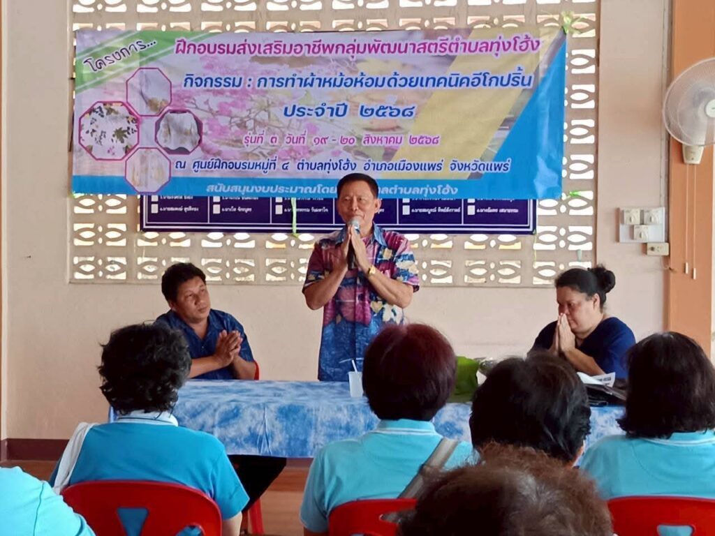 “นายกสราวุธ หมื่นโฮ้ง” ทต.ทุ่งโฮ้ง เป็นประธานเปิดโครงการส่งเสริมอาชีพกลุ่มพัฒนาสตรีตำบลทุ่งโฮ้ง ณ ศาลาอเนกประสงค์ชุมชนหมู่ที่ 4 ฯ เมื่อเวลา 09.00 น.วันที่ 19 สิงหาคม 2568 ณ ศาลาอเนกประสงค์ชุมชนหมู่ที่ 4 ตำบลทุ่งโฮ้ง อำเภอเมืองแพร่ จังหวัดแพร่ นายสราวุธ หมื่นโฮ้ง นายกเทศมนตรีตำบลทุ่งโฮ้ง เป็นประธานเปิดโครงการส่งเสริมอาชีพกลุ่มพัฒนาสตรีตำบลทุ่งโฮ้ง โดยการฝึกอบรมดังกล่าวเป็นอบรมเสริมสร้างทักษะให้กับกลุ่มสตรีแม่บ้านในการทำผ้าหม้อห้อมด้วยเทคนิคอีโก้ปริ้น โครงการนี้ซึ่งจะดำเนินการตั้งแต่วันที่ 19-20 สิงหาคม 2568 และได้สนับสนุนงบประมาณโดยเทศบาลตำบลทุ่งโฮ้ง ธีรพงษ์ ธงออน/แพร่ 061-595-5297
