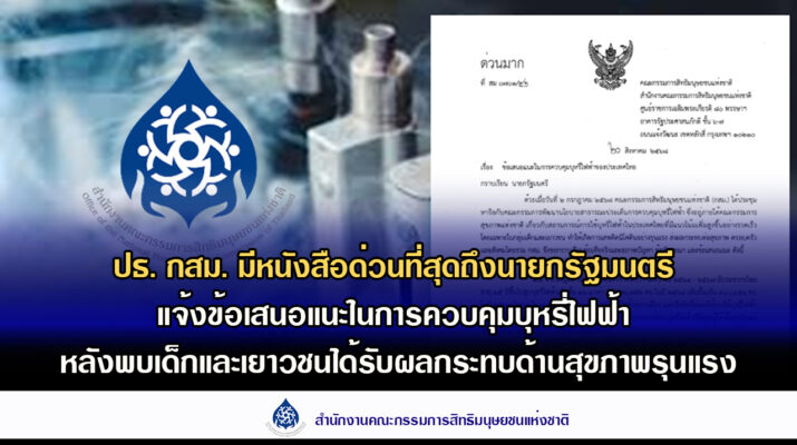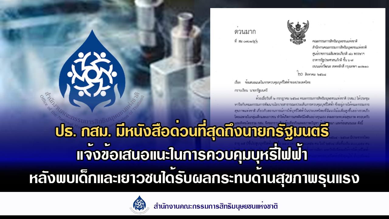 ประธาน กสม. มีหนังสือด่วนที่สุดถึงนายกรัฐมนตรี แจ้งข้อเสนอแนะในการควบคุมบุหรี่ไฟฟ้า หลังพบเด็กและเยาวชนใช้มากขึ้นอย่างรวดเร็ว และได้รับผลกระทบด้านสุขภาพรุนแรง