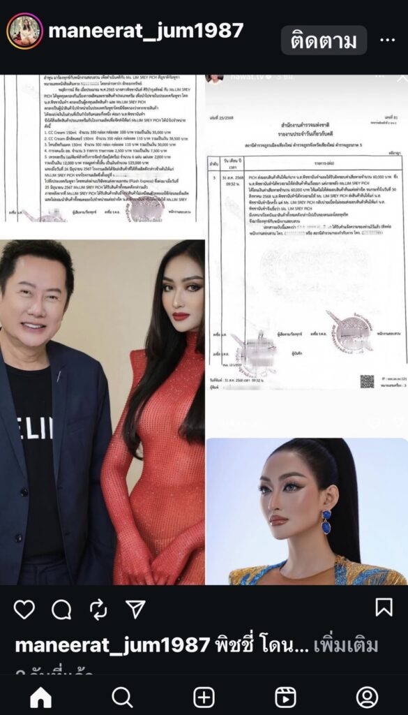 ”บอสณวัฒน์“แชร์ข้อมูล พิชชี่ Miss Universe Cambodia 2025 ชักดาบค่าสินค้าเครื่องสำอาง เข้าข่ายยักยอกทรัพย์ วานนี้ (7 ก.ย.68 ) เพจ “ณวัฒน์ อิสรไกรศีล – Mr.Nawat Itsaragrisil”ที่มีผู้ติดตามกว่า 1.5 ล้านคน ประธานและผู้ก่อตั้ง Miss Grand International ได้แชร์โพสต์เรื่องราวของ Pich Votey Saravody หรือ พิชชี่ Miss Universe Cambodia 2025 ที่ถูก น.ส.พิชชานันท์ ศิริบำรุงพัฒน์ PD Miss Grand ลำพูน-ลำปาง / Miss Universe สระบุรี 2025 แจ้งความดำเนินคดีในข้อหา ยักยอกทรัพย์ พร้อมระบุข้อความว่า “ถ้าพิชชี่เข้ามาไทยเจอแน่” โดย น.ส.พิชชานันท์ ได้นำหลักฐานการแจ้งความเข้าพบเจ้าหน้าที่ตำรวจ สภ.เมืองเชียงใหม่ เมื่อ 31 ส.ค.ที่ผ่านมา โดยมีรายละเอียดว่า Ms. LIM SREY PICH (พิชชี่) ได้ตกลงซื้อขายสินค้าเครื่องสำอางเพื่อนำไปจำหน่ายที่ประเทศกัมพูชาเป็นมูลค่ากว่า 123,000 บาท -เมื่อวันที่ 24 มิถุนายน 2567 น.ส.พิชชานันท์ได้โอนเงินค่าสินค้าให้พิชชี่ครบถ้วน -พิชชี่ได้รับสินค้าจากโรงงานผู้ผลิตแล้ว แต่กลับไม่ยอมส่งมอบสินค้าให้แก่ น.ส.พิชชานันท์ และไม่ยอมคืนเงิน -แม้จะมีการตกลงว่าจะชดใช้เงินคืนให้ 60,000 บาท แต่พิชชี่ก็ยังไม่ดำเนินการ -ก่อนหน้านี้ พิชชี่และเพื่อนสาวงามชาวกัมพูชา นาโน ได้ออกมาไลฟ์สดชี้แจงว่าสาเหตุที่ไม่ส่งคืนสินค้า ว่าเนื่องจากสินค้า “ไม่มีคุณภาพ” กรณีนี้ถือเป็นการสร้างความเสื่อมเสียให้กับเวทีขาอ่อน และสร้างความสงสัยว่าสุดท้ายแล้วเรื่องราวจะเป็นอย่างไรต่อไป เมื่อผู้เกี่ยวข้องได้ตัดสินใจใช้กฎหมายจัดการปัญหาในครั้งนี้