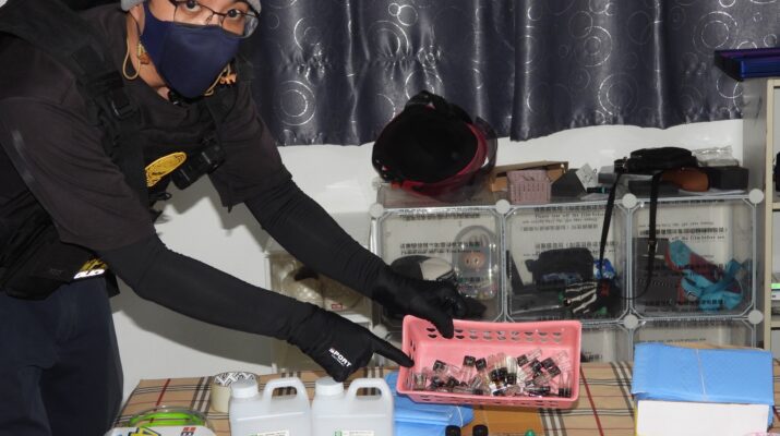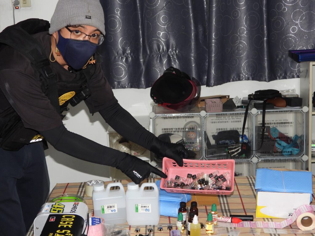 ตรวจยึดยาเสพติดของกลาง เป็นวัตถุออกฤทธิ์ประเภท 2 (คีตามีน) จำนวน 20 ถุง พร้อมหัวเชื้อผสมอาหาร, วัตถุดิบผสมหัวบุหรี่ไฟฟ้า, อุปกรณ์แพ็คส่ง, เครื่องซีน เป็นจำนวนมาก