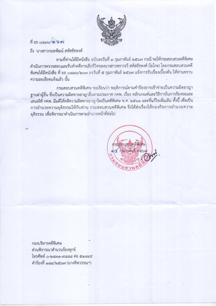 แหล่งข่าวระบุว่า ดีเอสไอ ได้แจ้งต่อ น.ส.กมลพัฒน์ ว่า มีความเป็นไปได้ที่จะพิจารณารับคดีนี้ไว้เป็นคดีพิเศษ ซึ่งจะนำไปสู่การสืบสวนสอบสวนที่เข้มข้นและครอบคลุมมากยิ่งขึ้น เพื่อคลี่คลายปริศนาการเสียชีวิตภายในคอนโดมิเนียมหรูย่านเอกมัย เมื่อวันที่ 1 พฤศจิกายน 2566 ซึ่งญาติยังคงติดใจในสาเหตุและเงื่อนงำที่เกิดขึ้น