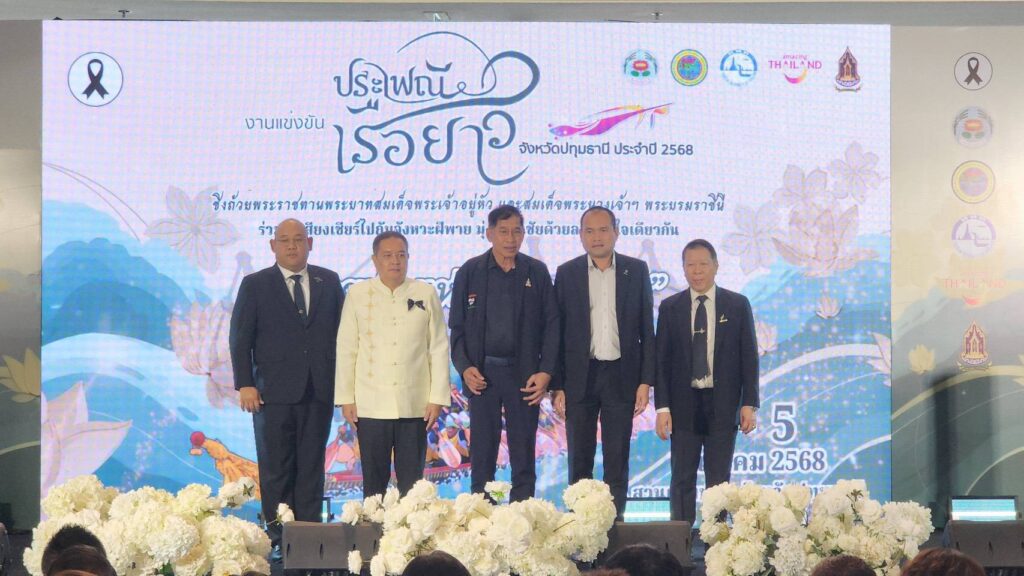 ปทุมธานี”พร้อมจัดใหญ่“แข่งขันเรือยาวประเพณี สายน้ำแห่งความภักดี ชิงถ้วยพระราชทานฯ 3-5 ธ.ค. กระตุ้นท่องเที่ยว เมื่อเวลา 13.30 น. วันที่ 21 พฤศจิกายน 2568 บริเวณลาน ZPELL ชั้น G ศูนย์การค้าฟิวเจอร์พาร์ค รังสิต นายเอกวิทย์ มีเพียร ผู้ว่าราชการจังหวัดปทุมธานี พร้อมด้วย พลตำรวจโท คำรณวิทย์ ธูปกระจ่าง นายกองค์การ บริหารส่วนจังหวัดปทุมธานี นายสหรัฐ โพธิโต รองผู้อำนวยการ สำนักงานการท่องเที่ยวแห่งประเทศไทย (ททท.) และ ร.ต.อ.ดร.ตรีลุพธ์ ธูปกระจ่าง นายกเทศมนตรีนครรังสิต ร่วมกันแถลงข่าว การจัดงานแข่งขัน เรือยาวประเพณี จังหวัดปทุมธานี ประจำปี 2568 สายน้ำ แห่งความภักดี ชิงถ้วยพระราชทาน พระบาทสมเด็จพระเจ้าอยู่หัว และ สมเด็จพระนางเจ้าฯ พระบรมราชินี ในวันที่ 3 – 5 ธันวาคม ณ ริมแม่น้ำเจ้าพระยา สวนเทพปทุม อำเภอเมืองปทุมธานี จังหวัดปทุมธานี โดยนายเอกวิทย์ มีเพียร ผู้ว่าราชการจังหวัดปทุมธานี กล่าวว่า นับเป็นงานประเพณีสำคัญของจังหวัดปทุมธานีที่จัดมาอย่างต่อเนื่องเป็นปีที่ 4 รัฐบาลมีนโยบายเร่งกระตุ้นการท่องเที่ยวในการฟื้นฟูและเปลี่ยนแปลงภาคการท่องเที่ยวในแต่ละท้องถิ่นให้เป็นรากฐานสำคัญ การจัดแข่งขันเรือยาวประเพณีก็เป็นอีกหนึ่งกิจกรรมที่เป็นการตอบสนองนโยบายรัฐบาลและที่สำคัญจังหวัดปทุมธานีเองก็ถือว่าเป็นเมืองที่เป็นพื้นราบลุ่มมีแม่น้ำเจ้าพระยาเส้นเลือดใหญ่ของคนภาคกลางไหลผ่านกลางเมือง จึงเป็นจุดก่อเกิดวัฒนธรรรม ประเพณีทางสายน้ำ การจัดกิจกรรมการแข่งขันเรือยาวประเพณีครั้งนี้ไม่เพียงแต่จะช่วยส่งเสริมนโยบายด้านการท่องเที่ยวและกระตุ้นเศรษฐกิจ ในพื้นที่เท่านั้น แต่ยังเป็นการอนุรักษ์และสืบสานวัฒนธรรมประเพณีการแข่งเรือพื้นบ้าน (เรือพายม้า) ของชุมชนริมฝั่งแม่น้ำลำคลองที่สืบทอดกันมายาวนานบนพื้นฐาน ความสามัคคี พร้อมเพรียง เป็นน้ำหนึ่ง ใจเดียวกันของคนในชุมชน ขณะเดียวกันเป็นการรณรงค์ให้พี่น้อง ชาวจังหวัดปทุมธานี และประชาชน ชาวไทยทุกคนได้ร่วมกันภาคภูมิใจอนุรักษ์วัฒนธรรมประเพณีที่ดีงามของไทยสืบไป ด้าน พลตำรวจโท คำรณวิทย์ ธูปกระจ่าง นายกองค์การบริหารส่วนจังหวัดปทุมธานี กล่าวว่า องค์การบริหารส่วนจังหวัดปทุมธานี มีความยินดีเป็นอย่างยิ่งที่ได้จัดงานแข่งขันเรือยาวประเพณี ในครั้งนี้ เป็นการจัดต่อเนื่องปีที่ 4 และตลอด 4 ปีก็ได้รับความร่วมมือจากทุกภาคส่วนทั้งราชการและเอกชนเป็นอย่างดี ขณะเดียวกัน ก็ถือได้ เป็นการปฏิบัติตามนโยบายที่ได้แถลงต่อสภาองค์การบริหารส่วนจังหวัดปทุมธานี เมื่อวันที่ 25 ตุลาคม 2567 ที่ ผ่านมา ซึ