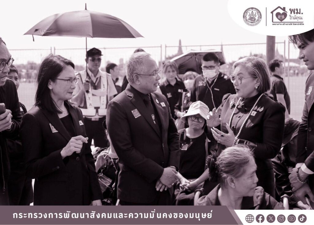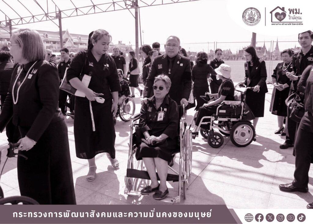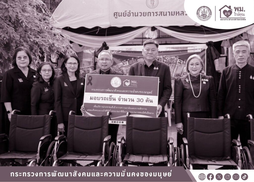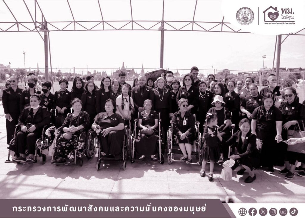 นายอัครา พรหมเผ่า รัฐมนตรีว่าการกระทรวงการพัฒนาสังคมและความมั่นคงของมนุษย์ (รมว.พม.) มอบหมายให้นายกันตพงศ์ รังษีสว่าง ปลัดกระทรวงการพัฒนาสังคมและความมั่นคงของมนุษย์ (ปลัด พม.) ลงพื้นที่ ณ ศูนย์อำนวยการจิตอาสาพระราชทาน ในบริเวณลานกลางแจ้ง ท้องสนามหลวง (ฝั่งมหาวิทยาลัยธรรมศาสตร์) เพื่อพบปะพูดคุย ให้กำลังใจคนพิการ ผู้ดูแลคนพิการ และผู้นำองค์กรคนพิการทุกประเภทความพิการ ที่ร่วมโครงการ “พม. ใกล้คุณ : ร้อยดวงใจพาคนพิการมาใกล้แม่” ซึ่งเป็นภารกิจสร้างโอกาส และส่งเสริมการมีส่วนร่วมของคนพิการและครอบครัว ตามนโยบาย “พม.ใกล้คุณ” ที่มุ่งเน้นการมีส่วนร่วมของคนพิการในกิจกรรมทางสังคมอย่างเท่าเทียม ตลอดจนเสริมสร้างความเข้าใจและเจตคติเชิงสร้างสรรค์ต่อคนพิการและความพิการ พร้อมทั้งส่งมอบรถเข็นนั่ง (วีลแชร์) จำนวน 30 คัน ให้กับศูนย์อำนวยการจิตอาสาพระราชทาน และกรุงเทพมหานคร เพื่อใช้ประโยชน์ในภารกิจของหน่วยงานและอำนวยความสะดวกสำหรับประชาชนที่มาถวายความอาลัยและถวายสักการะพระบรมศพ สมเด็จพระนางเจ้าสิริกิติ์ พระบรมราชินีนาถ พระบรมราชชนนีพันปีหลวง โดยได้รับเกียรติจาก ดร.หม่อมหลวง ณฐภา กิติยากร ประธานโครงการ ใจเราเท่ากันเสมอภาคด้วยคุณค่า พร้อมด้วยนางสาวสนธยา บุณยภูษิต อธิบดีกรมส่งเสริมและพัฒนาคุณภาพชีวิตคนพิการ และคณะผู้บริหารกระทรวง พม. เข้าร่วม จากนั้น นำคนพิการ ผู้ดูแลคนพิการ และผู้นำองค์กรคนพิการทุกประเภทความพิการ จำนวน 350 คน เดินทางเข้าถวายสักการะพระบรมศพ สมเด็จพระนางเจ้าสิริกิติ์ พระบรมราชินีนาถ พระบรมราชชนนีพันปีหลวง ณ พระที่นั่งดุสิตมหาปราสาท ในพระบรมมหาราชวัง