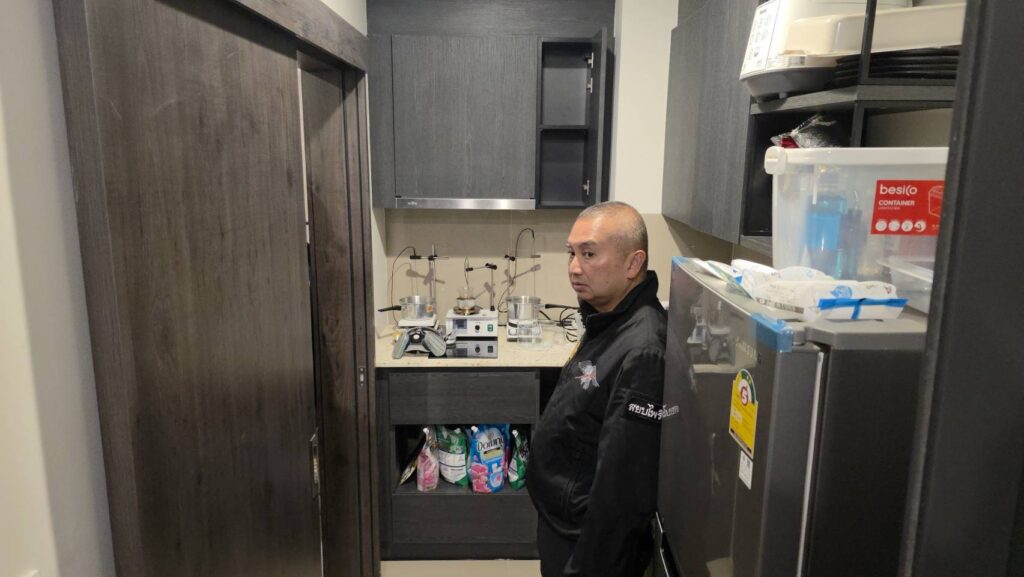 ตำรวจปราบปรามยาเสพติดบุกจับชายชาวจีน อายุ 30 ปี ที่เปิดโรงงานผลิตพอตบุหรี่ไฟฟ้าผสมสารอีโทมิเดท ในคอนโดมิเนียมแห่งหนึ่งย่านห้วยขวาง