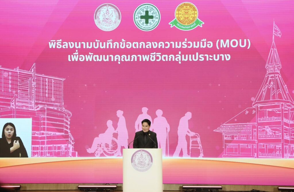 นายอัครา พรหมเผ่า รัฐมนตรีว่าการกระทรวงการพัฒนาสังคมและความมั่นคงของมนุษย์ (รมว.พม.) เป็นประธานในพิธีลงนามบันทึกข้อตกลงความร่วมมือ (MOU) เพื่อพัฒนาคุณภาพชีวิตกลุ่มเปราะบาง” ระหว่างกระทรวงการพัฒนาสังคมและความมั่นคงของมนุษย์ กับโรงพยาบาลธรรมศาสตร์เฉลิมพระเกียรติ และคณะแพทยศาสตร์ มหาวิทยาลัยธรรมศาสตร์ โดยมี ศาสตราจารย์ ดร.ศุภสวัสดิ์ ชัชวาลย์ อธิการบดีมหาวิทยาลัยธรรมศาสตร์ กล่าวต้อนรับ และศาสตราจารย์ ดร.สุรพล นิติไกรพจน์ นายกสภามหาวิทยาลัยธรรมศาสตร์ กล่าวแสดงเจตจำนงความร่วมมือ ทั้งนี้ นายกันตพงศ์ รังษีสว่าง ปลัดกระทรวงการพัฒนาสังคมและความมั่นคงของมนุษย์ (ปลัด พม.) , รองศาสตราจารย์ นายแพทย์ดิลก ภิยโยทัย ผู้อำนวยการโรงพยาบาลธรรมศาสตร์เฉลิมพระเกียรติ และรองศาสตราจารย์ แพทย์หญิงอัจฉรา ตั้งสถาพรพงษ์ คณบดีคณะแพทยศาสตร์ มหาวิทยาลัยธรรมศาสตร์ ร่วมลงนาม ณ ศูนย์ประชุมคณะแพทยศาสตร์ ชั้น 8 ศูนย์ฝึกทักษะทางการแพทย์ธรรมศาสตร์ (TMEd) มหาวิทยาลัยธรรมศาสตร์ ศูนย์รังสิต จังหวัดปทุมธานี