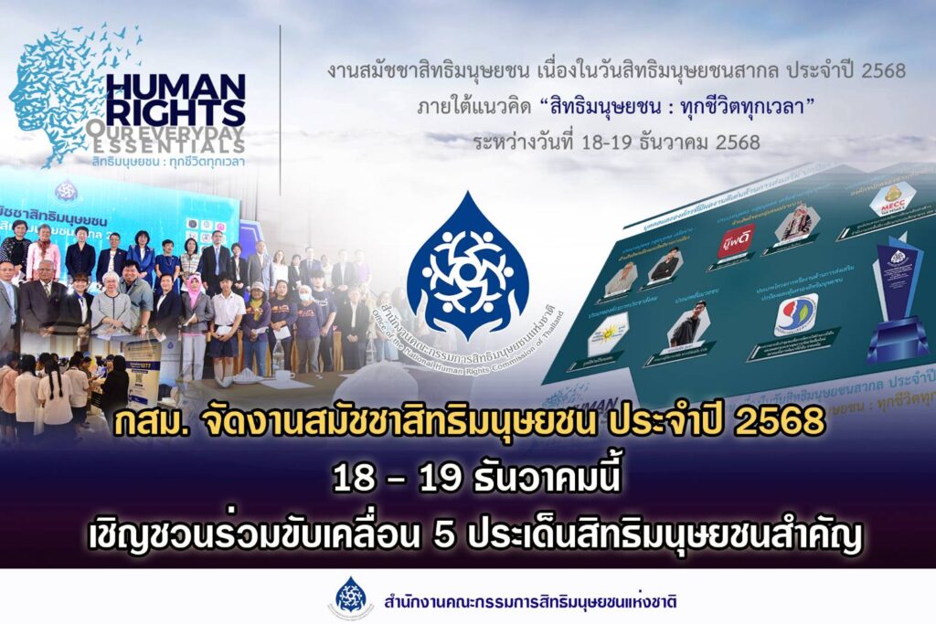 กสม. กำหนดจัดงานสมัชชาสิทธิมนุษยชน ประจำปี 2568 ภายใต้แนวคิด “สิทธิมนุษยชน: ทุกชีวิตทุกเวลา” 18 – 19 ธันวาคมนี้ เชิญชวนร่วมขับเคลื่อน 5 ประเด็นสิทธิมนุษยชนสำคัญ