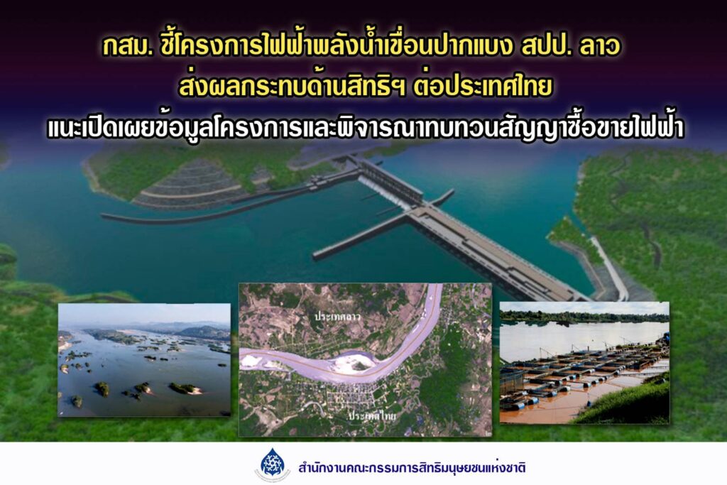 - กสม. ชี้โครงการไฟฟ้าพลังน้ำเขื่อนปากแบง สปป. ลาว ส่งผลกระทบด้านสิทธิฯ ต่อประเทศไทย แนะ ก.พลังงาน – กฟผ. เปิดเผยข้อมูลรายละเอียดโครงการและพิจารณาทบทวนสัญญาซื้อขายไฟฟ้า