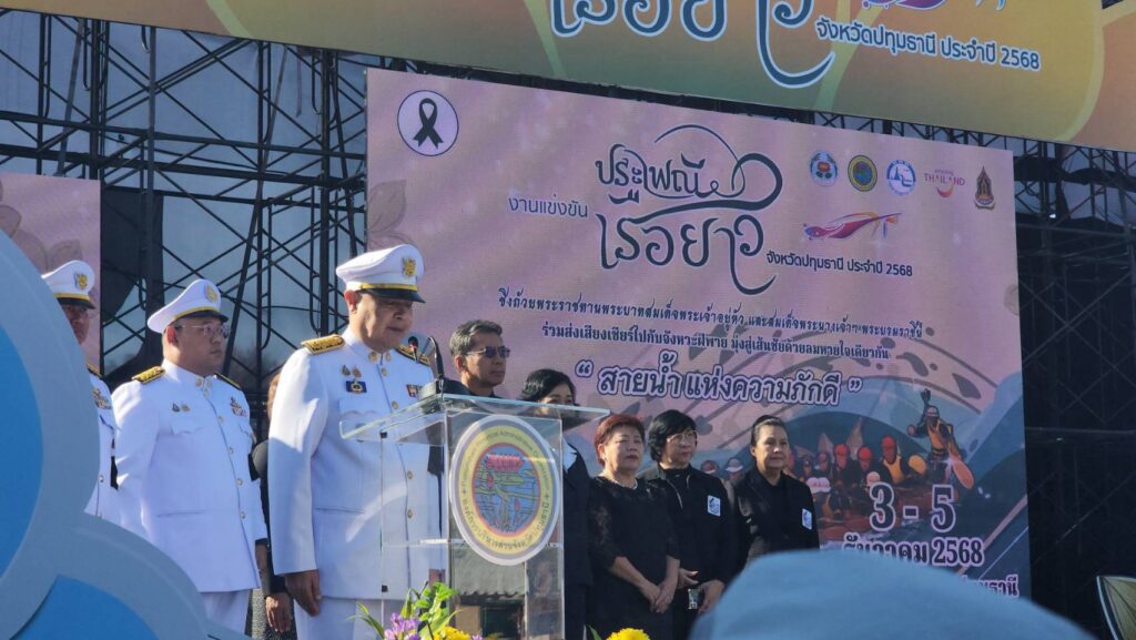 เมื่อเวลา 09.00 น.วันที่ 4 ธันวาคม 2568 นายเอกวิทย์ มีเพียร ผู้ว่าราชการจังหวัดปทุมธานี เป็นประธานเปิดโครงการจัดงานแข่งขันเรือยาวประเพณี จังหวัดปทุมธานี ชิงถ้วยพระราชทานพระบาทสมเด็จพระเจ้าอยู่หัว และสมเด็จพระนางเจ้าฯ พระบรมราชินี ประจำปี 2568 โดยมี พล.ต.ท.คำรณวิทย์ ธูปกระจ่าง นายกองค์การบริหารส่วนจังหวัดปทุมธานี ดร.ตรีลุพธ์ ธูปกระจ่าง นายกเทศมนตรีนครรังสิต สมาขิกสภาองค์การบริหารส่วนจังหวัดปทุมธานี หัวหน้าส่วนราชการและหน่วยงานที่เกี่ยวข้องเข้าร่วม ณ สวนเทพปทุมเฉลิมพระเกียรติ อำเภอเมืองปทุมธานี จังหวัดปทุมธานี โดยก่อนการแข่งขัน มีขบวนแห่ พิธิเชิญถ้วยพระราชทานพระบาทสมเด็จพระเจ้าอยู่หัว และสมเด็จพระนางเจ้าฯ พระบรมราชินี จากโรงเรียนปทุมวิไล จนมาถึง ที่ สวนเทพปทุมเฉลิมพระเกียรติ โดยมีประชาชนจำนวนมากให้ความสนใจ