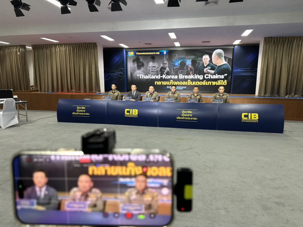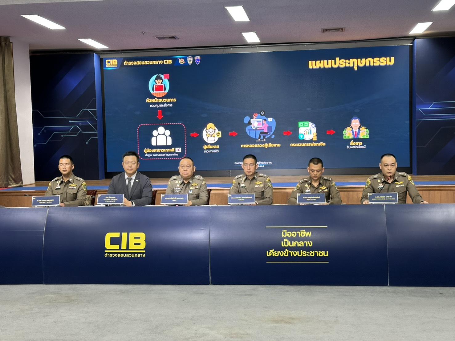 ตำรวจสอบสวนกลาง (CIB) ร่วมมือสถานเอกอัครราชทูตสาธารณรัฐเกาหลีประจำประเทศไทย ปฏิบัติการบุกทลายแก๊งคอลเซ็นเตอร์ชาวเกาหลีใต้ กองบังคับการปราบปรามการกระทำความผิดเกี่ยวกับอาชญากรรมทางเทคโนโลยี (บก.ปอท.) ภายใต้การอำนวยการของ พล.ต.ท.ณัฐศักดิ์ เชาวนาศัย ผบช.ก., พล.ต.ต.อธิป พงษ์ศิวาภัย รอง ผบช.ก., พล.ต.ต.โสภณ สารพัฒน์ รอง ผบช.ก., พล.ต.ต.ชนันนัทธ์ สารถวัลย์แพศย์ ผบก.ปอท., พ.ต.อ.วัชรพันธ์ ศิริพากย์, พ.ต.อ.เนติ วงษ์กุหลาบ รอง ผบก.ปอท., พ.ต.อ.ภานุภัท กิตติพันธ์ ผกก.1 บก.ปอท. เจ้าหน้าที่ตำรวจ กก.1 บก.ปอท. ชุดจับกุมประกอบด้วย พ.ต.ท.เอกพล แสงอรุณ, พ.ต.ท.ธีรภพ พันธุชาติ รอง ผกก.1 บก.ปอท., พ.ต.ท.ณัฐวุฒิ มาระตา รอง ผกก.(สอบสวน) กก.1 บก.ปอท., พ.ต.ท.หญิง หทัยชนก อินทรวิจิตร, พ.ต.ต.กษิดิศ ดิลกคุณานันท์ สว.กก.1 บก.ปอท., ร.ต.อ.ทัศพงษ์ ผ่องใส, ร.ต.อ.ปฏิญญา สงวนศักดิ์เกษร, ร.ต.อ.วิฑิตพงษ์ ราชู รอง สว.กก.1 บก.ปอท., ด.ต.พีรวุฒิ โชติช่วง, ด.ต.ภานุวัติ เปี้ยนสีทอง, ด.ต.เอกชัย บุญบุตร,ด.ต.หญิง อภิลักษณ์ รัตนิยะ, จ.ส.ต.เจตธัช มหินทรเทพ, จ.ส.ต.กฤติเดช หอละเอียด ผบ.หมู่ กก.1 บก.ปอท ร่วมกับ เจ้าหน้าที่แผนกกงสุลตำรวจสถานเอกอัครราชทูตสาธารณรัฐเกาหลีประจำประเทศไทย และ เจ้าหน้าที่ตำรวจ กลุ่มงานสนับสนุนฯ บก.ปอท. ร่วมกันจับกุมผู้ต้องหาชาวเกาหลีใต้และชาวจีน จำนวน 17 ราย ได้แก่ 1. Mr.JOENGMIN LEE (ลี จองมิน) อายุ 31 ปี สัญชาติเกาหลีใต้ 2. Mr.INTAE KIM (คิม อินแท) อายุ 32 ปี สัญชาติเกาหลีใต้ 3. Mr.Takoon HA (ฮา แทกุน) อายุ 38 ปี สัญชาติเกาหลีใต้ 4. Mr.JIYUL KIM (คิม จียุล) อายุ 32 ปี สัญชาติเกาหลีใต้ 5. Mr.SUNHAN EOM (ออม-ซอน-ฮัน) อายุ 34 ปี สัญชาติเกาหลีใต้ 6. Mr.JUNYEOP KIM (คิม-จุน-ย็อบ) อายุ 28 ปี สัญชาติเกาหลีใต้ 7. Mr.JESUP BYEON (บยอน-เจ-ซ็อบ) อายุ 33 ปี สัญชาติเกาหลีใต้ 8. Mr.EUNKYUN KIM (คิม-อึน-กยุน) อายุ 43 ปี สัญชาติเกาหลีใต้ 9. Mr.SUNGGYUN KWON (คว็อน-ซ็อง-กยุน) อายุ 30 ปี สัญชาติเกาหลีใต้ 10. Mr.YUL HONG (ฮง-ยุล) อายุ 29 ปี สัญชาติเกาหลีใต้ 11. Mr.MUNCHEOL CHO (โจ-มุน-ช็อล) อายุ 35 ปี สัญชาติเกาหลีใต้ 12. Mr.TAEHWAN LIM (อิม-แท-ฮวัน) อายุ 35 ปี สัญชาติเกาหลีใต้ 13. Mr.JEONGBEEN LEE (ลี-จอง-บิน) อายุ 29 ปี สัญชาติเกาหลีใต้ 14. Mr.TAEGWON LEE (ลี-แท-กวอน) อายุ 27 ปี สัญชาติเกาหลีใต้ 15. Mr.MINGZHENG LIU (หลิว-หมิง-เจิ้ง) อายุ 29 ปี สัญชาติจีน 16. Mr.CAIHUA LI (อี-แช-ฮวา) อายุ 43 ปี สัญชาติจีน 17. Mr.LINHU CHE (ชา-ริน-ฮู) อายุ 35 ปี สัญชาติจีน ในความผิดฐาน “เป็นคนต่างด้าวทำงานโดยไม่มีใบอนุญาตทำงาน และเป็นบุคคลต่างด้าวอยู่ในราชอาณาจักรโดยการอนุญาตสิ้นสุด” ตามมาตรา 8 ประกอบมาตรา 101 แห่ง พรก.การบริหารการจัดการการทำงานของคนต่างด้าว พ.ศ.2560 และมาตรา 81 แห่ง พรบ.คนเข้าเมือง พ.ศ.2522 พฤติการณ์ของคดี สืบเนื่องจากประเทศไทยและสาธารณรัฐเกาหลีใต้มีความสัมพันธ์อันดีระหว่างกันมาโดยตลอด และมีแนวทางร่ว