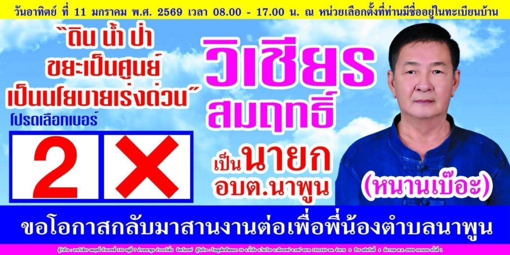 ชาวนาพูน หนุน ! “วิเชียร สมฤทธิ์” (หนานเบ๊อะ) เป็นนายก อบต.นาพูน เบอร์ 2 เพื่อแก้ปัญหาให้ชาวตำบลนาพูน “ดิน น้ำป่า ขยะเป็นศูนย์” ตามที่คณะกรรมการการเลือกตั้งกำหนดให้มีการเลือกตั้งนายกและสมาชิกสภาองค์การบริหารส่วนตำบล ในวันอาทิตย์ที่ 11 มกราคม 2569 นี้ ที่องค์การบริหารส่วนตำบลนาพูน อำเภอวังชิ้น จังหวัดแพร่ นายวิเชียร สมฤทธิ์(หนานเบ๊อะ) อดีตนายกองค์การบริหารส่วนตำบลนาพูน เป็นผู้สมัคร นายกอบต.นาพูน เบอร์ 2 และพี่น้องชาวนาพูน ต้องการให้มาสานงานต่อ ซึ่งเป็นปัญหาของตำบลนาพูน ที่สะสมมานาน และเป็นการสอดคล้องกับนโยบาย นายวิเชียรฯ ที่ชูแก้ปัญหาให้ชาวตำบลนาพูน “ดิน น้ำป่า ขยะเป็นศูนย์” ด้วยชาวตำบลนาพูน กล่าวเป็นเสียงเดีวกันว่า ปัญหาทั้งหมดชาวตำบลนาพูนได้ร่วมแรงร่วมใจ มีการดำเนินการไปบ้างส่วนแล้วเพียงแต่วาระการบริหารงานมีเวลา เพียง 48 เดือนหรือ 4 ปี หมดวาระก่อน และต้องมีการเลือกนายกและสมาชิก สภาฯ ชาวนาพูน อยากเห็นการทำงานมีต่อเนื่องด้วย ซึ่งปัญหารอการแก้ไขที่วางกันไว้ 1.ดิน – การขอกันพื้นที่ทำกินและที่อยู่อาศัยออกจากเขตป่าแม่ยมตะวันออก – ป่าบ่อแก้ว , แม่สูง-แม่สิน ตามสิทธิในการครอบครอง และการพัฒนาเส้นทางต่าง ๆ ในพื้นที่ตำบลนาพูน ถนนสายแม่แปง-นาพูน และถนนทุกสายในพื้นที่ตำบลนาพูน 2. น้ำ – อ่างเก็บน้ำ จำนวน 4 อ่าง จะต้องได้รับการก่อสร้างและพัฒนาเป็นแหล่งต้นน้ำเพื่อกักเก็บน้ำเพื่อใช้ใช้ในการเกษตรและอุปโภค – บริโภค ในพื้นที่ตำบลนาพูน และบริหารจัดการอย่างเป็นระบบเกิดความอุดมสมบูรณ์ 3.ป่า – จะพัฒนาป่าชุมชนในพื้นที่ตำบลนาพูนจะต้องได้รับการพัฒนา แปลง “ป่า” ให้เป็น “คาร์บอนเครดิต”สร้างรายได้ในชุมชน ปัจจุบัน ที่บ้านเป่าปมดงยาง หมู่ที่ 7 ตำบลนาพูนมีการพัฒนาแปลงป่าให้เป็น “คาร์บอนเครดิต” เรียบร้อยแล้ว มีงบประมาณมาบริหารจัดการป่าได้แล้ว4. ขยะเป็นศูนย์ – จะต้องได้รับการจัดการ ให้ถูกต้อง ให้เป็นศูนย์- คัดแยกขยะเปียก – รีไซเคิล – ขยะพลาสติกนำมาคืนสภาพเป็นน้ำมัน – ขยะอินทรีย์นำมาทำปุ๋ย – เผาด้วยระบบไร้มลพิษกำจัดให้เป็นศูนย์”ทั้งหมดนี้ เป็นโครงการต่างๆ ที่จะแก้ไขปัญหาให้กับพี่น้องชาวตำบลนาพูนให้มีความอยู่ดีกินดีในอนาคตอย่างแน่นอนส่วนของพี่น้องชาวตำบลนาพูน ตอบรับออกมาเป็นเสียงเดียวกันว่า ในวันอาทิตย์ที่ 11 มกราคม 2569 นี้ ได้บอกต่อปากต่อปากให้เชิญชวนพี่น้องชาวตำบลนาพูนทั้งตำบลออกไปใช้สิทธิ์เลือกตั้ง ให้เลือก “วิเชียร สมฤทธิ์” เบอร์ 2 เป็นนายกอบต. เพื่อจะได้สานงานต่อที่ค้างคาไว้นั้น และเป็นงานที่พี่น้องชาวต