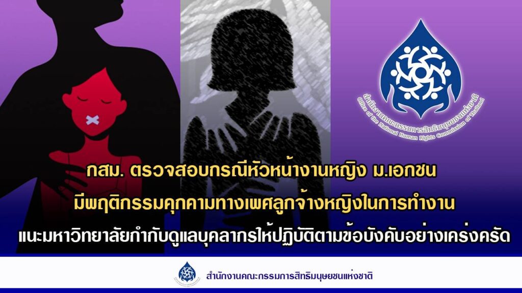 กสม. ตรวจสอบกรณีหัวหน้างานหญิงมหาวิทยาลัยเอกชนแห่งหนึ่งมีพฤติกรรมคุกคามทางเพศลูกจ้างหญิงในการทำงาน แนะมหาวิทยาลัยกำกับดูแลบุคลากรให้ปฏิบัติตามข้อบังคับอย่างเคร่งครัด