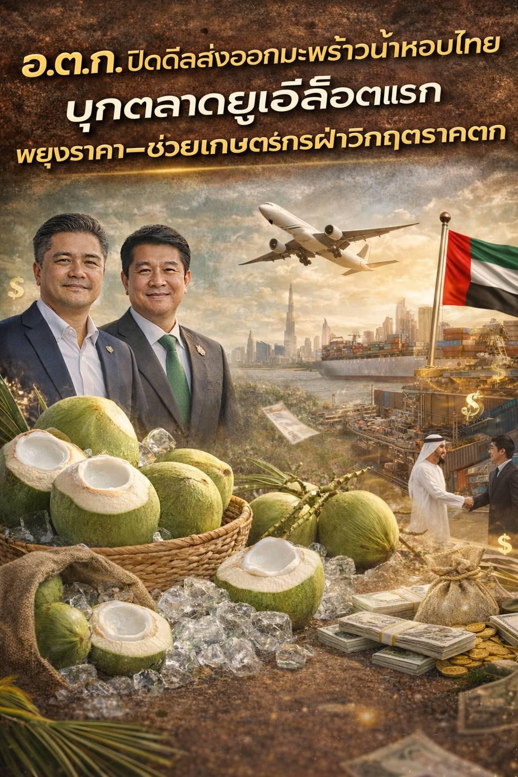 อ.ต.ก. ปิดดีลส่งออกมะพร้าวน้ำหอมไทย ลุยตลาดยูเออีล็อตแรก หวังดันราคา–เพิ่มรายได้เกษตรกร องค์การตลาดเพื่อเกษตรกร (อ.ต.ก.) ประสบความสำเร็จในการเจรจาการค้า เตรียมจัดส่งมะพร้าวน้ำหอมไทยบุกตลาดสหรัฐอาหรับเอมิเรตส์ (UAE) เป็นล็อตแรก หลังเข้าร่วมเจรจากับภาคเอกชนต่างชาติในงาน Gulfood Dubai 2026 ถือเป็นอีกก้าวสำคัญในการเปิดตลาดตะวันออกกลาง และช่วยพยุงราคามะพร้าวน้ำหอมที่กำลังเผชิญภาวะราคาตกต่ำในประเทศ นายวิณะโรจน์ ทรัพย์ส่งสุข ปลัดกระทรวงเกษตรและสหกรณ์ พร้อมด้วย นายปณิธาน มีไชยโย ผู้อำนวยการ อ.ต.ก. เปิดเผยว่า การเจรจาครั้งนี้เกิดขึ้นร่วมกับบริษัท Prima Biz General Trading L.L.C และ Dubai Food District ระหว่างวันที่ 26–31 มกราคม 2568 โดยมีเป้าหมายหลักเพื่อเพิ่มช่องทางการส่งออกผลผลิตมะพร้าวน้ำหอมของไทยไปยังตลาดศักยภาพอย่างตะวันออกกลาง เบื้องต้นคาดว่าจะสามารถกระจายผลผลิตมะพร้าวน้ำหอมไทยได้ไม่น้อยกว่า 200,000 ลูก ซึ่งจะช่วยดูดซับผลผลิตส่วนเกินในประเทศ เป็นกลไกสำคัญในการพยุงราคา และสร้างเสถียรภาพรายได้ให้เกษตรกรผู้ปลูกมะพร้าวน้ำหอมอย่างเป็นรูปธรรม อ.ต.ก. ยืนยันจะทำหน้าที่เป็นหัวขบวนในการขยายโอกาสทางการตลาดใหม่ ๆ ให้เกษตรกรไทย โดยเน้นการส่งออกมะพร้าวน้ำหอมคุณภาพสูงเข้าสู่ตลาดต่างประเทศ เพื่อบรรเทาผลกระทบจากภาวะราคาชะลอตัวในประเทศ และยกระดับสินค้าเกษตรไทยสู่เวทีโลกอย่างยั่งยืน #อ.ต.ก #มะพร้าวน้ำหอม #ส่งออกมะพร้าวไทย #ตลาดตะวันออกกลาง #UAE #GulfoodDubai #ช่วยเกษตรกร #พยุงราคาผลผลิต #สินค้าเกษตรไทย #เศรษฐกิจการเกษตร