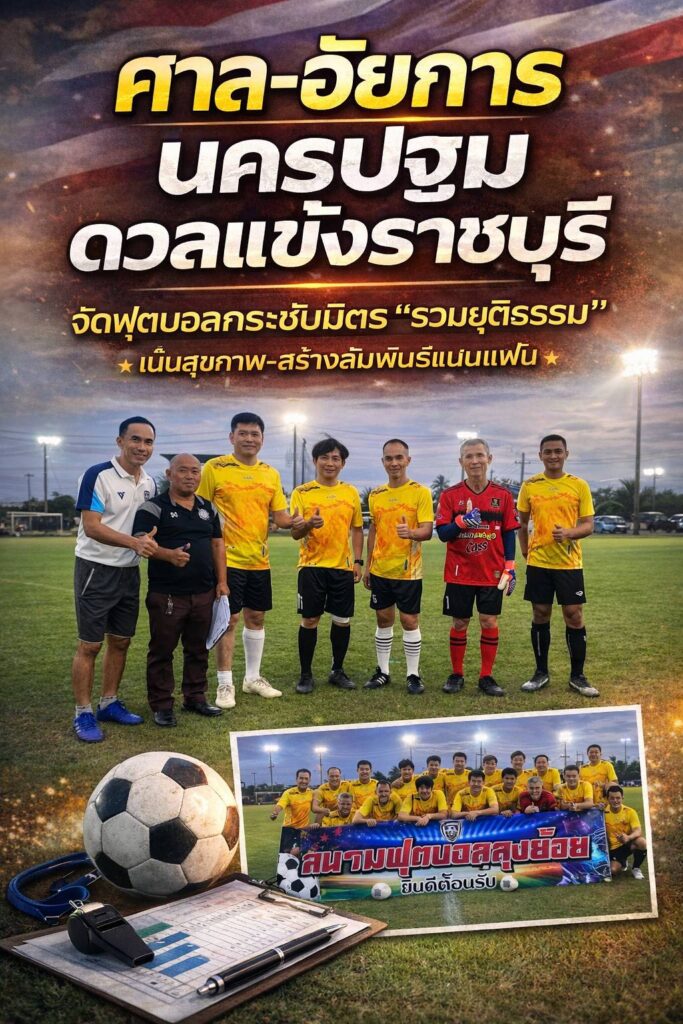 กระชับมิตรรวมยุติธรรม…26ก.พ.69..ณ.สนามลุงย้อย.ต.โคกพระเจดีย์.อ.นครชัยศรี.จ.นครปฐมทีมฟุตบอลรวมยุติธรรมจังหวัดนครปฐมนำโดยท่านแก๊บนายพิเนศว์อัสวัสเรืองกุล.ผู้พิพากษาหัวหน้าศาลจังหวัดนครปฐม..นายโอฬาริกขวัญชัยผู้พิพากษาสำนักงานอธิบดีผู้พิพากษาภาค7..นายถิรโรจน์สายเพชร.ผู้พิพากษาศาลแขวงนครปฐม..นายนาวินมั่นไสย์ผู้พิพากษาศาลแขวงนครปฐม..นายวิริยะบูชาเกียรติผู้พิพากษาศาลเยาวชนจังหวัดนครปฐม..อัยการกฎษดาชูโตพร้อมสมาชิกทีมฟุตบอลรวมยุติธรรมจังหวัดนครปฐมจัดกิจกรรมออกกำลังกายเพื่อสุขภาพด้วยการเชิญทีมฟุตบอลรวมยุติธรรมจังหวัดราชบุรีที่นำโดยนายธนาธิปปิยะพงษ์พิสุทธิ์ผู้พิพากษาหัวหน้าศาลจังหวัดราชบุรี..นายณรงค์ทับทิมใสผู้พิพากษาหัวหน้าศาลแขวงจังหวัดราชบุรีมาร่วมแข่งขันกระชับมิตรโดยเน้นการออกกำลังกายมากกว่าชัยชนะซึ่งบรรยากาศเต็มไปด้วยมิตรภาพโดยตลอดการแข่งขันมีนายคณิศรด้วงแพงบรรณาธิการข่าวกีฬาสำนักขาวราชการเป็นผู้บรรยาย..และมีทีมงานสนามฟุตบอลนายย้อยที่นำโดย.ร.ต.อ.ศุภกฤตรังษีบุตรหรือที่รู้จักกันในนามโค้ชดอนซึ่งเป็นโค้ชทีมฟุตบอลวีไอพีตำรวจภูธรภาค7และเป็นผู้ดูแลสนามแห่งนี้พร้อมทีมงานให้การต้อนรับและดูแลการแข่งขันเป็นอย่างดี
