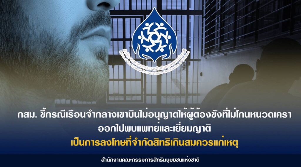ตามที่ปรากฎบนสื่อออนไลน์รายงานว่า คณะกรรมการสิทธิมนุษยชนแห่งชาติ (กสม.) ชี้เรือนจำกลางเขาบินไม่อนุญาตให้ผู้ต้องขังที่ไม่โกนหนวดเคราออกไปพบแพทย์-เยี่ยมญาติ เป็นการลงโทษที่จำกัดสิทธิเกิน