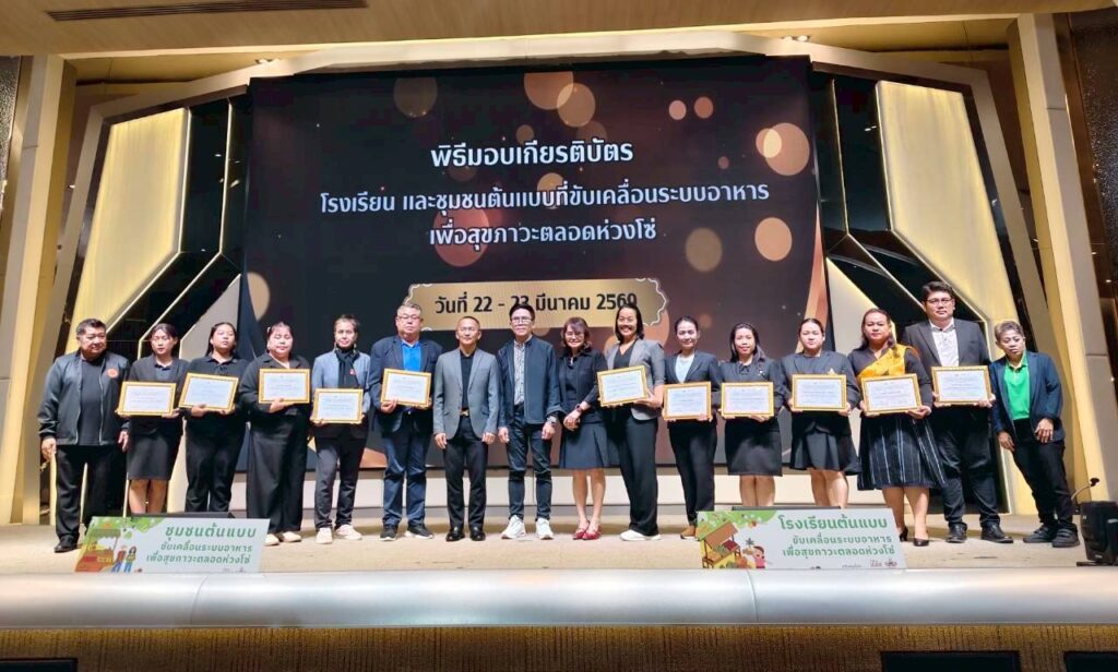 เมื่อวันที่ 23 มี.ค. 2569 ที่ ห้องประชุมราชาวดี โรงแรมเซาท์เทอร์แอร์พอร์ต อำเภอหาดใหญ่ จ.สงขลา นายเอกชัย แก้วรัตนะ นายอำเภอหาดใหญ่ เป็นผู้แทนผู้ว่าราชการจังหวัดสงขลา ให้เกียรติเป็นประธาน มอบเกียรติบัตรแก่โรงเรียนและชุมชนต้นแบบ ในการขับเคลื่อนระบบเพื่อสุขภาวะตลอดห่วงโซ่ ในจังหวัดสงขลา,ปทุมธานี, พัทลุง, นครปฐม ,สุพรรณบุรี ในเวทีสรุปผลการดำเนินงาน แลกเปลี่ยน ถอดบทเรียน และมอบเกียรติบัตร โรงเรียนและชุมชนต้นแบบที่ขับเคลื่อนระบบอาหารเพื่อสุขภาวะตลอดห่วงโซ่ สนับสนุนโดยสำนักงานกองทุนสนับสนุนการสร้างเสริมสุขภาพ (สสส.) พร้อมด้วยอาจารย์ สง่า ดามาพงษ์ ผู้ทรงคุณวุฒิ สสส. ดร.ณัจยา แก้วนุ้ย ผู้รับผิดชอบโครงการฯ และ ดร.วิฑูร อินทจันท์ นายกสมาคมการค้าธุรกิจอาหาร