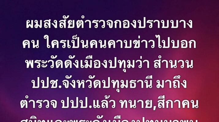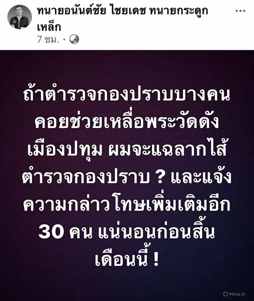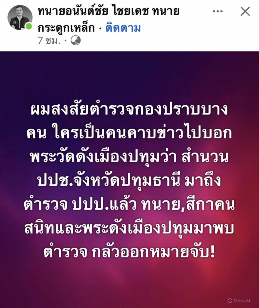ทนายกระดูกเหล็ก เผย พระดังวัดเมืองปทุมฯ จะแอบดอดเข้า พงส.ปปป.หลัง ปปช.ส่งสำนวนคดีเงินโบนัสเงินกฐินคืน ปปป. เมื่อวันที่ 26 มี.ค.69 ที่ อาคารพิทักษ์สันติ กองบัญชาการตำรวจสอบสวนกลาง พลตำรวจตรี จรูญเกียรติ ปานแก้วรองผู้บัญชาการตำรวจสอบสวนกลาง เปิดเผยว่า เมื่อคืนวานนี้(25 มี.ค.) ได้รับรายงานว่า พระคึกฤทธิ์ โสตฺถิผโล เจ้าอาวาสวัดนาป่าพง จังหวัดปทุมธานี และทนายความ ได้เดินทาง มาพบพนักงานสอบสวน เพื่อสอบถามความคืบหน้าทางคดี หลังจากที่ ป.ป.ช.ชี้มูลความผิดแล้วส่งสำนวนกลับมาให้ บก.ปปป.ดำเนินการสอบสวนต่อ ฐานความผิดฟอกเงิน ในคดีโบนัสเงินจากการทอดกฐินของวัดนาป่าพง โดยขอเวลาตรวจสอบรายละเอียดทั้งหมดก่อน วันนี้เวลา 14.00 น. จะมีความชัดเจนเกี่ยวกับกรณีนี้ และจะเปิดเผยข้อมูลแก่สื่อมวลชนอีกครั้ง ผู้สื่อข่าวรายงานว่า เมื่อหัวค่ำวานนี้ มีรถเบ้นซ์ สีขาวทะเบียนXXX9 มาจอดติดเครื่องโดยไม่มีใครลงจากรถนานกว่า 2 ช.ม.ก่อนเดินทางกลับไป ผู้สื่อข่าวที่มาเฝ้ารอคาดว่าน่าจะเป็นรถที่พระดังวัดปทุมฯ เดินทางมารอพบ พงส.บก.ปปป. ด้าน ทนายอนันต์ชัย ไชยเดช หรือทนายกระดูกเหล็ก ได้โพสต์ Facebook ระบุว่า ทนายอนันต์ชัย ไชยเดช ทนายกระดูกเหล็ก“ได้ข่าวว่า ขณะนี้ ทนาย สีกา และพระวัดดังเมืองปทุม ดอดพบ พนักงานสอบสวน บก.ปปป.จริงหรือไม่ ? มาทำไมหรือครับ ?“ “ผมสงสัยตำรวจกองปราบบางคน ใครเป็นคนคาบข่าวไปบอกพระวัดดังเมืองปทุมว่า สำนวน ปปช.จังหวัดปทุมธานี มาถึง ตำรวจ ปปป.แล้ว ทนาย,สีกาคน สนิทและพระดังเมืองปทุมมาพบตำรวจ กลัวออกหมายจับ” “ทราบว่า มีตำรวจกองปราบชั้นผู้ใหญ่บางคน คอยช่วยเหลือพระวัดดังเมืองปทุม มูลนิธิทนาย กองทัพธรรม จะทำหนังสือร้องเรียน ผบ.ตร. !“