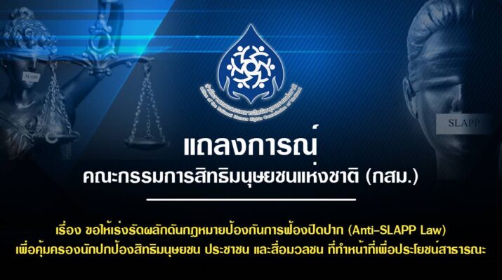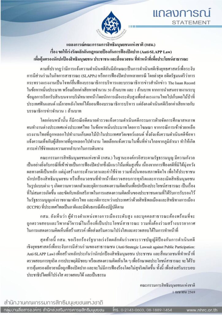 สุดท้ายนี้ กสม. ขอเรียกร้องรัฐบาลเร่งรัดผลักดันร่างพระราชบัญญัติป้องกันการดำเนินคดีเชิงยุทธศาสตร์เพื่อระงับการมีส่วนร่วมของสาธารณชน (Anti-Strategic Lawsuit against Public Participation: Anti-SLAPP Law) เพื่อสร้างหลักประกันว่านักปกป้องสิทธิมนุษยชน ประชาชน และสื่อมวลชนที่ทำหน้าที่ตรวจสอบการทุจริต การประพฤติมิชอบ หรือแสดงความคิดเห็นใด ๆ เพื่อรักษาผลประโยชน์สาธารณะ จะได้รับการคุ้มครองเยียวยาเมื่อถูกฟ้องปิดปาก และจะไม่มีการฟ้องร้องโดยไม่สุจริตเกิดขึ้น ทั้งนี้ เพื่อส่งเสริมระบอบประชาธิปไตยที่โปร่งใส ตรวจสอบได้ และเป็นธรรม