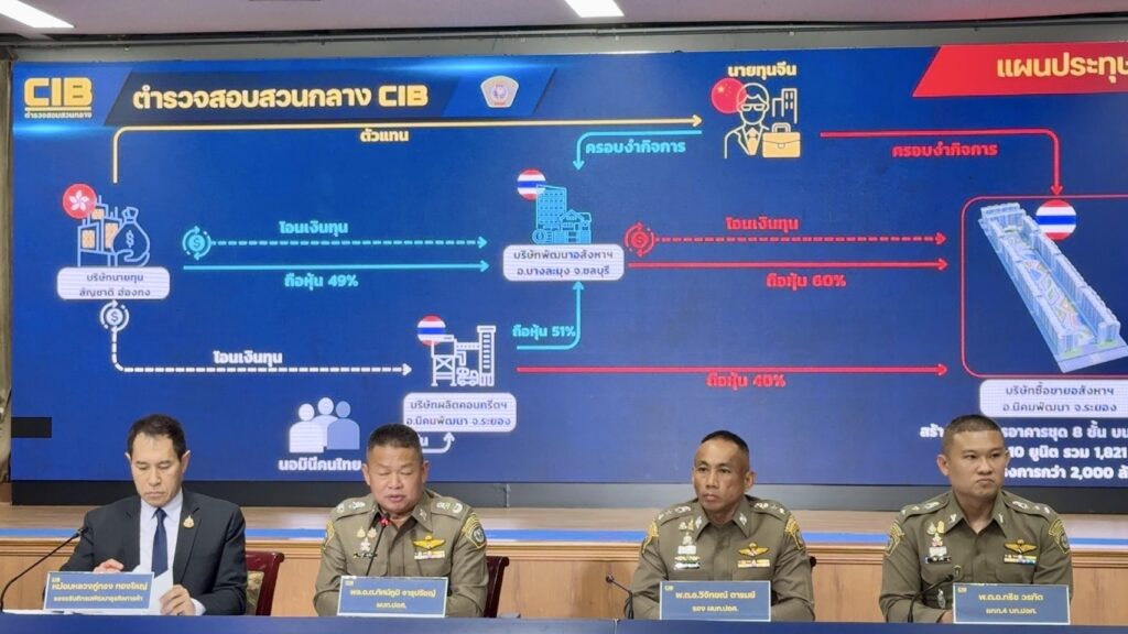 ตำรวจสอบสวนกลาง (CIB) ปฏิบัติการ CIB Nominee sweep ep.3 ทลายนอมินีจีน ฮุบที่ดินระยอง สร้างคอนโดหรู 2 พันล้าน พบการบริหารยันก่อสร้างใช้คนจีนครบวงจร กองบัญชาการตำรวจสอบสวนกลาง โดย กองบังคับการปราบปรามการกระทำผิดเกี่ยวกับอาชญากรรมทางเศรษฐกิจ (บก.ปอศ.) ภายใต้การอำนวยการของ พล.ต.ท.จิรภพ ภูริเดช ผบช.ก., พล.ต.ต.ทัศน์ภูมิ จารุปรัชญ์ ผบก.ปอศ, พ.ต.อ.วิจักขณ์ ตารมย์ รอง ผบก.ปอศ., พ.ต.อ.นิตติโชติ เพ็ญจำรัส รอง ผบก.ปอศ., พ.ต.อ.วิวิฒน์ จิตโสภากุล รอง ผบก.ปอศ. เจ้าหน้าที่ชุดปฏิบัติการ นำโดย พ.ต.อ.กริช วรทัต ผกก.4 บก.ปอศ., พ.ต.ท.วีระศักดิ์ ติระพัฒน์ รอง ผกก.4 บก.ปอศ.,พ.ต.ท.สมชาย ศรพล รอง ผกก.4 บก.ปอศ., พ.ต.ท.รัฐพร คงสุโข รอง ผกก.4 บก.ปอศ., พ.ต.ท.ภาคิน ไกรกิตติชาญ รอง ผกก.4 บก.ปอศ., พ.ต.ท.เชาวน์วุฒิ เลียบมา รอง ผกก.(สอบสวน) กก.4 บก.ปอศ., พ.ต.ท.สาธิต หาวงษ์ชัย สว.กก.4 บก.ปอศ.,พ.ต.ท.วรวุฒิ คงรักษา สว.กก.4 บก.ปอศ., พ.ต.ท.ณัฐดนัย บำรุงศิลป์ สว.กก.4 บก.ปอศ. และ พ.ต.ต.หญิง ชนากานต์ นิรัมย์ สว.กก.4 บก.ปอศ. พร้อมกำลังเจ้าหน้าที่ตำรวจ สอบสวนกลาง กก.4 บก.ปอศ. ร่วมกันตรวจค้น เครือข่ายบริษัทนอมินี ในเขตพื้นที่จังหวัดระยอง และชลบุรี รวม 3 จุด ดำเนินคดี 1.นิติบุคคล จำนวน 4 ราย ประกอบด้วย 1.) บริษัท กู๊ดวิวฯ จำกัด สัญชาติฮ่องกง 2.) บริษัท เทอร์ร่าฯ จำกัด สัญชาติไทย 3.) บริษัท สกายฯ จำกัด สัญชาติไทย 4.) บริษัท โอเชียนฯ จำกัด สัญชาติไทย 2.บุคคล จำนวน 11 ราย ประกอบด้วย 1.) นายหลีฟางฯ สัญชาติจีน (กรรมการบริษัท) 2.) นางสาววรติฯ สัญชาติไทย (กรรมการบริษัทและผู้ถือหุ้น) 3.) นายประเสริฐฯ สัญชาติไทย (ผู้ถือหุ้น) 4.) นายชายฤทธิ์ฯ สัญชาติไทย (ผู้ถือหุ้น) 5.) นายปุณณัตถ์ฯ สัญชาติไทย (ผู้ถือหุ้น) 6.) นายเต๋าฯ สัญชาติจีน (คนคุมงาน) 7.) นายเจียงฯ สัญชาติจีน (ช่างประปา) 8.) นายเซี้ยะฯ สัญชาติจีน (ช่างปูน) 9.) นายหวังฯ สัญชาติจีน (คนคุมงาน) 10.) นายเฮาฯ สัญชาติจีน (ผู้ออกแบบ) 11.) นายซวงฯ สัญชาติจีน (ผู้ออกแบบ) รายการตรวจยึด 1.เอกสารทะเบียนบริษัท 10 ชุด 2.สมุดบัญชีธนาคาร 48 เล่ม 3.โน้ตบุ๊ก 2 เครื่อง โทรศัพท์มือถือ 3 เครื่อง 4.โฉนดที่ดิน 7 ฉบับ เนื้อที่ รวม 72 ไร่ 5.สัญญาซื้อขายที่ดิน 1 ฉบับ 6.ตราประทับบริษัท 6 ชิ้น 7.Token ธนาคาร 7 ชิ้น ฐานความผิด 1.พ.ร.บ.การประกอบธุรกิจของคนต่างด้าว พ.ศ.2542 2.พระราชบัญญัติให้ใช้ประมวลกฎหมายที่ดิน พ.ศ.2497 3.พระราชกำหนดการบริหารการจัดการการทำงานของคนต่างด้าว พ.ศ.2560 พฤติการณ์ ด้วยกองบัญชาการตำรวจสอบสวนกลาง และกรมพัฒนาธุรกิจการค้า ได้มีการลงนามในบันทึกความเข้าใจ (MOU) “การป้องกันและปราบปรามปัญหาการเปิดบัญชีม้าของนิติบุคคล และการใช้คนไทยเป็นตัวแทนอำพราง (NOMINEE)” บูรณาการแลกเปลี่ยนข้อมูลและทำงานร่วมกัน เพื่อป้องกั