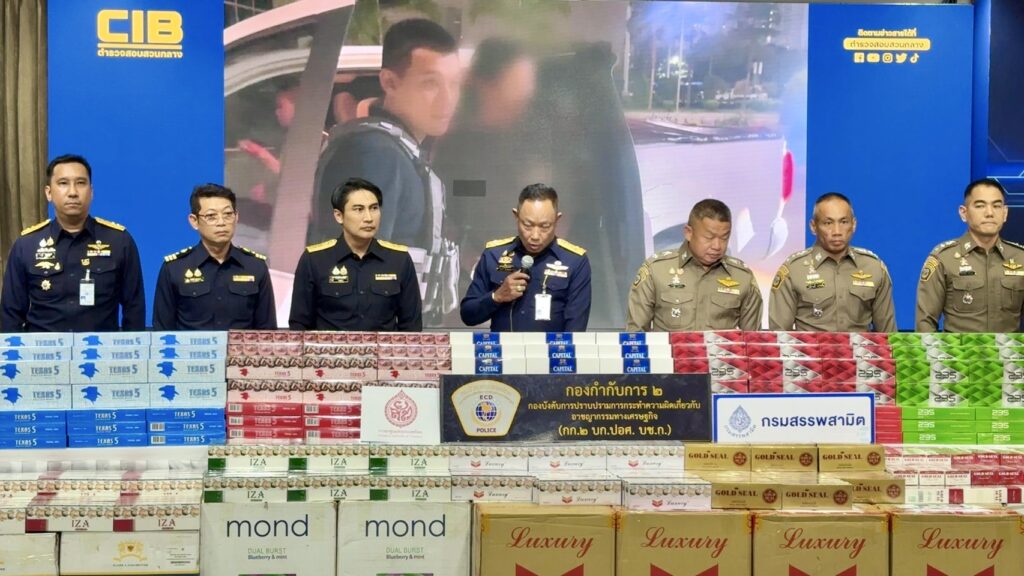 ตำรวจสอบสวนกลาง (CIB) เปิดปฏิบัติการทลายเครือข่ายค้าบุหรี่เถื่อนข้ามชาติรายใหญ่ รวบชาวกัมพูชา 2 ราย พร้อมของกลาง 50,000 ซองรัฐสูญเสียรายได้กว่า 3,000,000 บาท กองบัญชาการตำรวจสอบสวนกลาง (CIB) โดย กองบังคับการปราบปรามการประทำผิดเกี่ยวกับอาชญากรรมทางเศรษฐกิจ (บก.ปอศ.) ภายใต้การอำนวยการของ พล.ต.ท.จิรภพ ภูริเดช ผบช.ก. ได้สั่งการให้ พล.ต.ต.ทัศน์ภูมิ จารุปรัชญ์ ผบก.ปอศ., พ.ต.อ.วิจักขณ์ ตารมย์ รอง ผบก.ปอศ., พ.ต.อ.จักรกริช เสริบุตรรอง ผบก.ปอศ.,พ.ต.อ.วิวัฒน์ จิตโสภากุล รอง ผบก.ปอศ. ว่าที่ พ.ต.อ.นฤพนธ์ กรุณา ผกก.2 บก.ปอศ. และ พ.ต.ท.วันเผด็จ จันยะรมณ์ รอง ผกก.2 บก.ปอศ.กรมสรรพสามิต โดย ดร.กุลยา ตันติเตมิท อธิบดีกรมสรรพสามิต, ว่าที่ร้อยตรียงยุทธ ภูมิประเทศ รองอธิบดี รักษาการในตำแหน่ง ที่ปรึกษาด้านยุทธศาสตร์ภาษีสรรพสามิต, นายสุเมธ ฤทธิ์เจริญ ผู้อำนวยการสำนักตรวจสอบป้องกันและปราบปราม ,นายวิโรจน์รัตน์ แจ่มวรรณา ผู้เชี่ยวชาญเฉพาะด้านการตรวจสอบสรรพสามิต ,นางสาวปารณีย์ ขุนวงษ์ ผู้อำนวยการส่วนป้องกันและปราบปราม 2 และ นายกฤตย์ ธรรมพิทักษ์ หัวหน้าฝ่ายป้องกันและปราบปราม 6 พร้อมด้วย สายตรวจสรรพสามิตชุดที่ 6.2เจ้าหน้าที่การยาสูบแห่งประเทศไทย โดย นายรักษ์ศักดิ์ อินทร์ปราบ รองผู้ว่าการด้านการจำหน่ายและบริการลูกค้า, นายวีรศักดิ์ แก้วลอยมา หัวหน้าสำนักป้องกันบุหรี่ผิดกฎหมาย, นายประเสริฐ เพ็ญไพจิตร พนักงานป้องกันและปราบปราม, น.ส.เสาวณีย์ สุวรรณโชติ พนักงานป้องกันและปราบปราม 7, นายวันฉัตร ลำเจียกเทศ พนักงานป้องกันและปราบปราม 6 และ นายธนงค์ นิธิธีรโชติ พนักงานป้องกันและปราบปราม 4คณะผู้แทน บริษัท ฟิลลิป มอร์ริส โดย มล.พงศ์ระพีพร อาภากร ผู้จัดการอาวุโส ด้านนโยบายภาษีและการค้าระหว่างประเทศ และ นางสาวรัฐสภา ทรัพย์เมือง หัวหน้าทีมด้านนโยบายภาษีและการปราบปรามบุหรี่ผิดกฎหมายเจ้าหน้าที่ชุดจับกุม นำโดย พ.ต.ท.พีระพัฒน์ สุทธเสนา สว.กก.2 บก.ปอศ., ร.ต.อ.นุศาสน์ เพชรเปี่ยมแสงงาม, ร.ต.อ.กษิดิ์พิชญ์ สุภาสูรย์รอง,ร.ต.ท.สุรเจตน์ ภู่ระหงษ์, ร.ต.ท.ชนกปกรณ์ กายูรวัฒน์, ร.ต.ต.คณาธิปสงพิมพ์, ว่าที่ ร.ต.ต.กำพล ล้อมวงษ์ รอง สว.(ป.) กก.2 บก.ปอศ. ,ด.ต.เปรมวิชช์ บินตาสุระสีห์, ด.ต.นพดลกั้งสกุล และ ด.ต.นิติธร ปานพวงแก้ว ผบ.หมู่ กก.2 บก.ปอศ.จับกุมตัวผู้ต้องหา ชาวกัมพูชา จำนวน 2 ราย1. Ms. Chiva Chuoy (จีวา) อายุ 35 ปี สัญชาติ กัมพูชา ผู้ต้องหาที่ 1 ดำเนินคดีในความผิดฐาน1.1)“ช่วยซ่อนเร้น ช่วยจำหน่าย ช่วยพาเอาไปเสีย ซื้อ รับจำนำหรือรับไว้ โดยประการใดซึ่งของอันตนพึงรู้ว่าเป็นของอันเข้ามาในหรือส่งออกไปนอกราชอาณาจักรซึ่งของที่ยังมิได้ผ่านพิธีการศ