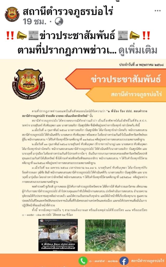 ผู้การฯ ตราด กำชับ สภ.บ่อไร่ เร่งรัดคดีและให้ความยุติธรรมทุกฝ่าย จากกรณีเมื่อวันที่ 2 พ.ค.ที่ผ่านมา ผสห.นายสุทธิ อายุ 67 ปี และ น.ส.เขมจิรา บัณฑูรนิพิท อายุ 61 ปี สองพี่น้อง เข้าร้อง พงส.บก.ปปป.ให้ตรวจสอบการปฏิบัติหน้าที่ของเจ้าหน้าที่ตำรวจชุดจับกุมและพนักงานสอบสวน สภ.บ่อไร่ ภ.จว.ตราด ว่าปฏิบัติหน้าที่โดยมิชอบฯ หรือไม่ นั้น ล่าสุด วานนี้ (7 พ.ค.)เฟซบุ๊กของ สถานีตำรวจภูธรบ่อไร่ ได้โพสต์ข่าวประชาสัมพันธ์ ว่า.... “ตามที่ปรากฎภาพข่าวเผยแพร่ในสื่อสังคมออนไลน์มีข้อความว่า “2 พี่น้อง ร้อง ปปป. สอบตำรวจสถานีตำรวจภูธรบ่อไร่ ช่วยอดีต นายพล กลั่นแกล้งหาลักทรัพย์” นั้น สถานีตำรวจภูธรบ่อไร จึงได้ประชาสัมพันธ์ข่าวดังนี้ ตามที่ปรากฏภาพข่าวเผยแพร่ในสื่อสังคมออนไลน์มีข้อความว่า "๒ พี่น้อง ร้อง ปปป. สอบตำรวจ สถานีตำรวจภูธรบ่อไร่ ช่วยอดีตนายพลกลั่นแกล้งหาลักทรัพย์" นั้น สถานีตำรวจภูธรบ่อไร ได้ตรวจสอบกรณีดังกล่าวแล้วว่า เป็นเรื่องพิพาทโต้แย้งสิทธิ์ในที่ดิน ส.ป.ก. ระหว่าง นายสุรินทร์ ทับพันบุพผา และ นางสาวเชมจิรา บัณฑูรนิพิท ซึ่งมีคดีอยู่ระหว่างการร้องทุกข์ กล่าวโทษกัน ดังนี้ ๑.เมื่อวันที่ ๓ กุมภาพันธ์ ๒๕๖๘ นางสาวเขมจิรา บัณฑูรนิพิท ได้มาร้องทุกข์กล่าวโทษกับ พนักงานสอบสวน สถานีตำรวจภูธรบ่อไร่ ให้ดำเนินคดีกับ นายสมควร ทับพันบุพผา พร้อมพวก ในข้อกล่าวหาร่วมกันเข้าไปในอสังหาริมทรัพย์ของผู้อื่น พนักงานสอบสวน ฯ ได้รับคำร้องทุกข์ไว้ตามคดีอาญาญาที่ ๑๑/๒๕๕๖๘ คดีอยู่ระหว่างการสอบสวนสวนรวมพยานหลักฐานหลักฐาน ๒.เมื่อวันที่ ๑๓ กุมภาพันธ์ ๒๕๖๘ นายสุรินทร์ ทับพับบุพผา (ข้าราชการบำนาญ) และ นายสมควร ทับพันบุพผา ได้มาร้องทุกข์กล่าวโทษกับ พนักงานสอบสวนสถานีตำรวรภูจภูธรบ่อไร่ ให้ดำเนินคดีกับนางสาวเชมจิรา บัณฑูรนิพิท และ นายวฤทธิ์ มารุ่งเรือง ในข้อกล่าวหาร่วมกันเข้าไปกระทำการใด ๆ อันเป็นการรบกวนการครอบครองอสังหาริมทรัพย์โดยปกติสุขและร่วมกันทำให้เสียทรัพย์ ซึ่งได้กระทำต่อพืชหรือพืชผลของกสิกร พนักงานสอบสวน ฯ ได้รับคำร้องทุกข์ไว้ตามคดีอาญาที่ ๒๓//๒๕๖๖๘ คดีอยู่ระหว่างการสอบสวนสวบรวมพยานหลักฐาน ๓.เมื่อวันที่ ๒๓ เมษายน ๒๕๖๘ เวลาประมาณ ๒๑.๓๘ น. นายสุรินทร์ ทับพันบุพผา ได้มาร้องทุกข์กับ ร้อยตำรวจเอก วุฒิชัย สิมลี พนักงานสอบสวนสถานีตำรวจภูธรบ่อไร่ ให้ดำเนินคดีกับ นางสาวเขมจิรา บัณฑูรนิพิท และนายวฤทธิ์ มารุ่งเรือง โดยกล่าวหาว่าลักทรัพย์ พนักงานสอบสวน ฯ ได้รับคำร้องทุกข์ไว้ตามคดีอาญาที่ ๖๕/๒๕๖๖๘ คดีอยู่ระหว่าง การสอบสวนรวบรวมพยานหลักฐาน พ