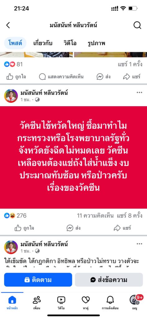 ปทุมธานี-นายกแจ็สไม่สน โพสต์ไร้สาระ ห่วงแค่โรคระบาด ขอบคุณชาวรังสิตมั่นใจสั่งสอนลูกเป็นคนอ่อนน้อมรู้จักเด็กรู้จักผู้ใหญ่ เมื่อเวลา 12.00 น. วันที่ 13 พฤษภาคม 2568 ที่ห้องทำงาน นายกองค์การบริหารส่วนจังหวัดปทุมธานี พลตำรวจโท คำรณวิทย์ ธูปกระจ่าง นายกองค์การบริหารส่วนจังหวัดปทุมธานี ได้เปิดใจกับทีมข่าวถึงเรื่องประเด็น ที่มี ส.ส.พรรคใหญ่ ในพื้นที่ ปทุมธานี นายมนัสนันท์ หลีนวรัตน์ หรือ ฟลุ๊ค ส.ส.ปทุมธานี เขต 5 พรรคเพื่อไทย ลูกชายนายกฤษดา ได้เคลื่อนไหวทางเพจเฟซบุ๊ก มนัสนันท์ หลีนวรัตน์ ตลอดวันที่ 12 พฤษภาคมที่ผ่านมา โดยการโพสข้อความลงเฟสบุ๊คส่วนตัว ซึ่งบางโพสต์มีความเกี่ยวข้องกับ การจะฉีดวัคซีนไข้หวัดใหญ่ และ บางโพสต์ได้ ท้าทายว่าไม่กลัวบุคคล อักษร เจ (J) ซึ่ง พลตำรวจโท คำรณวิทย์ ธูปกระจ่าง นายกองค์การบริหารส่วนจังหวัดปทุมธานี กล่าวว่า ผมว่าเราอย่าไปให้ค่า ตัว เจ(J )ก็มีตั้งเยอะแยะ แล้วแต่คนจะคิด ว่าเป็น เจ(J )ไหน ผมไม่วิตกกังวลน่ะแล้วสิ่งที่ออกมาเป็น ภาพแบบนี้ทุกอย่างมันอยู่ที่พี่น้องประชาชนจะคิดจะเข้าใจ จะมองในรูปแบบไหน ในส่วนตัวผมเอง จากการเลือกตั้งที่ผ่านมาครั้งนี้ ขออย่างเดียวว่า ผล แพ้ ชนะ มันออกมาแล้ว ก็ขอให้ ผู้ที่ชนะการเลือกตั้งแล้วก็ขอให้ ทำเพื่อพี่น้องประชาชน คนปทุมธานี ผมอยากเห็นปทุมธานีเดินหน้าไปพร้อมๆ กัน และที่สำคัญตอนนี้โรคระบาดกำลังร้ายแรงมาก ทั้งโควิท ทั้ง ไข้หวัดใหญ่ คนที่มาโจมตีเรื่องวัคซีน ผม ต้องเรียนนิดนึงว่า การที่ อบจ.ปทุมธานี ตัดสินใจ ดำเนินการ ตามระเบียบเพื่อ ซื้อวัคซีนไข้หวัดใหญ่ 4 สายพันธุ์ ฉีดให้พี่น้องชาวปทุมธานีทั้งหมดนั้น ก็เป็นไปตามมติของคณะกรรมการป้องกันโรคติดต่อ ของจังหวัดปทุมธานี โดย ท่านผู้ว่าราชการจังหวัดเป็นประธาน มีมติที่ประชุมให้ อบจ.จัดซื้อ เพราะฉะนั้น อบจ.จึงได้หารือกับทาง สาธารณสุขแล้ว และทาง สาธารณสุขบอกตัวเลขมาน่ากลัว ซึ่งอยากให้ประชาชนสนใจกับเรื่องโรคภัยไข้เจ็บมากกว่า ผมขอให้พี่น้องรีบไปฉีดนะครับเพราะว่า วัคซีนตัวนี้ไม่ไช่ว่าฉีดเข้าไปในร่างกายเราแล้วจะมีภูมิคุ้มกันทันที ภาษาแพทย์ เรียกว่าต้องให้เวลา ขึ้นภูมิ กว่าจะขึ้นภูมิ หรือมีภูมิ มันต้องใช้เวลา 15 – 30 วัน รีบฉีดตอนนี้ ตัวเลขสาธารณสุขคำนวณแล้วว่า ในเดือน มิถุนายน กับเดือน กรกฎาคม ไข้หวัดใหญ่สายพันธุ์ A จะระบาดสูงสุด โดย พลตำรวจโท คำรณวิทย์ ธูปกระจ่าง นายกองค์การบริหารส่วนจังหวัดปทุมธานี กล่าวต่ออีกว่า ในส่วนที่เป็นข่าวไม่อยากให้พี่น้องไปวิตกกังวล ผมไม่ได้สนใจอะไรเลย และต้องขอขอบคุณพ